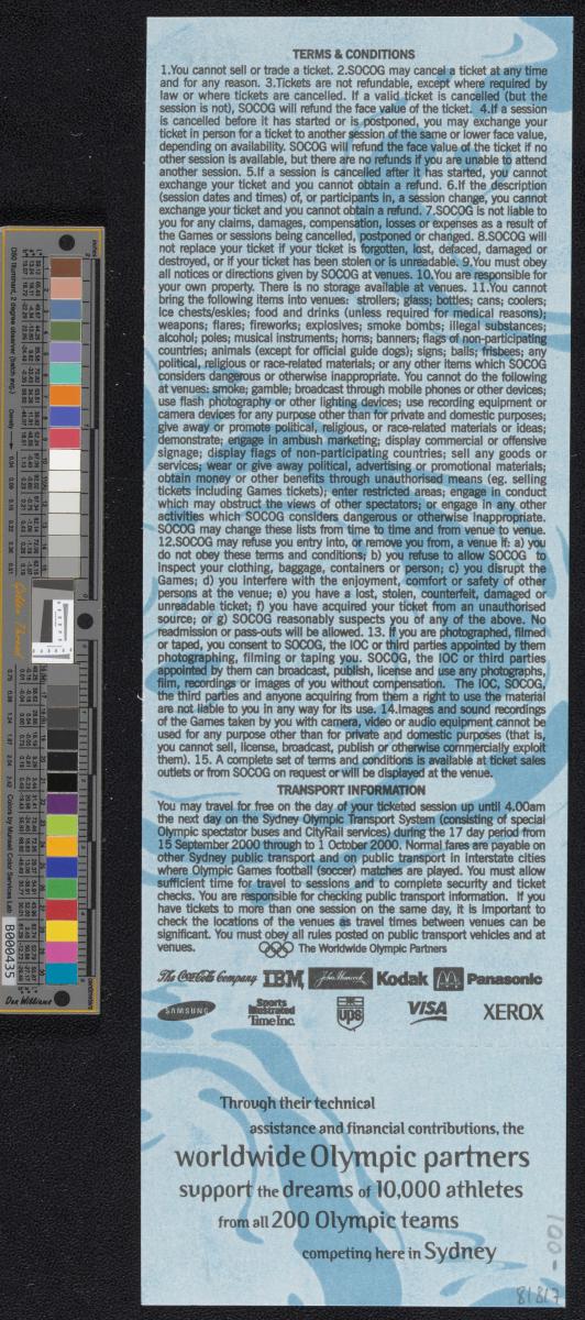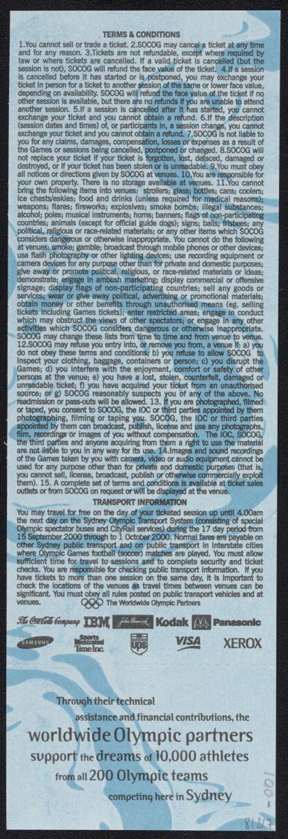 Admission ticket with the Games emblem and pictogram of the sport. Place and location of the seat. On the back conditions and list of top sponsors.