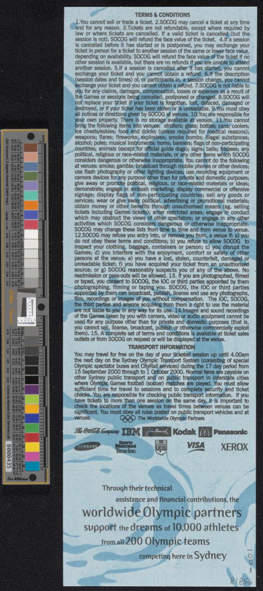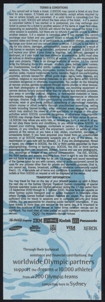 Admission ticket with the Games emblem and pictogram of the sport. Place and location of the seat. On the back conditions and list of top sponsors.
