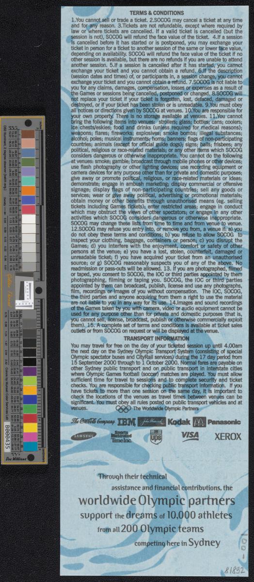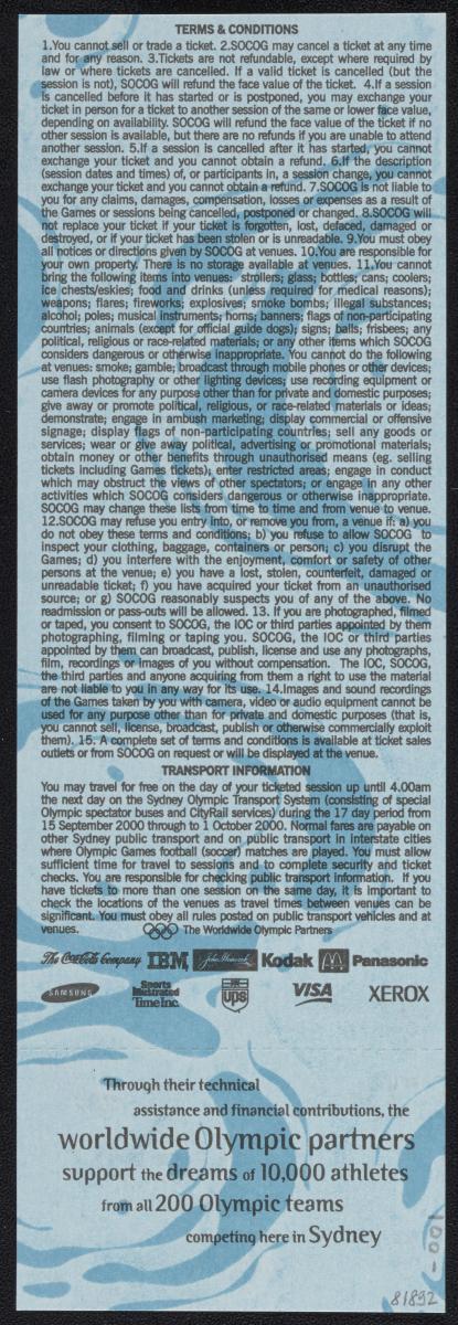 Admission ticket with the Games emblem and pictogram of the sport. Place and location of the seat. On the back conditions and list of top sponsors.