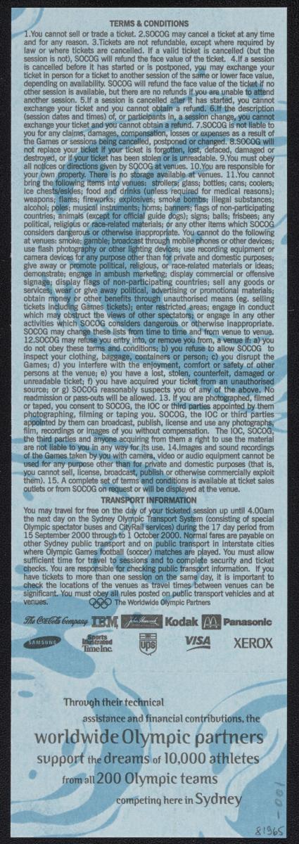 Admission ticket with the Games emblem and pictogram of the sport. Place and location of the seat. On the back conditions and list of top sponsors.
