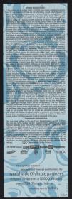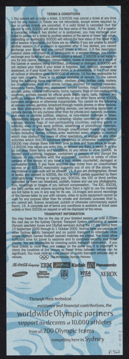 Admission ticket with the Games emblem and pictogram of the sport. Place and location of the seat. On the back conditions and list of top sponsors.
