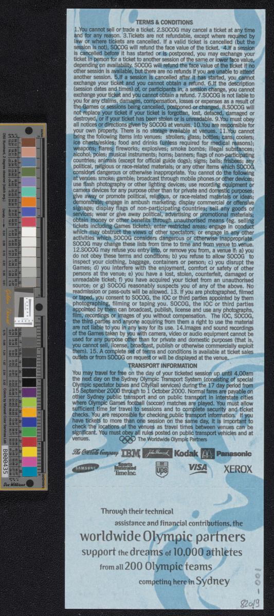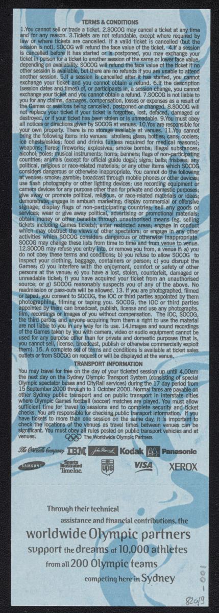 Admission ticket with the Games emblem and pictogram of the sport. Place and location of the seat. On the back conditions and list of top sponsors.