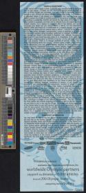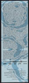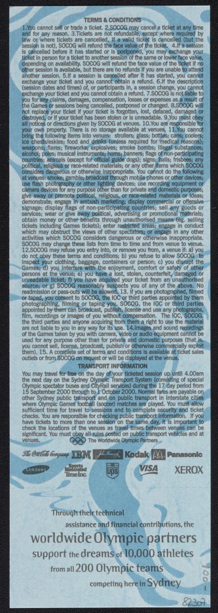 Admission ticket with the Games emblem and pictogram of the sport. Place and location of the seat. On the back conditions and list of top sponsors.