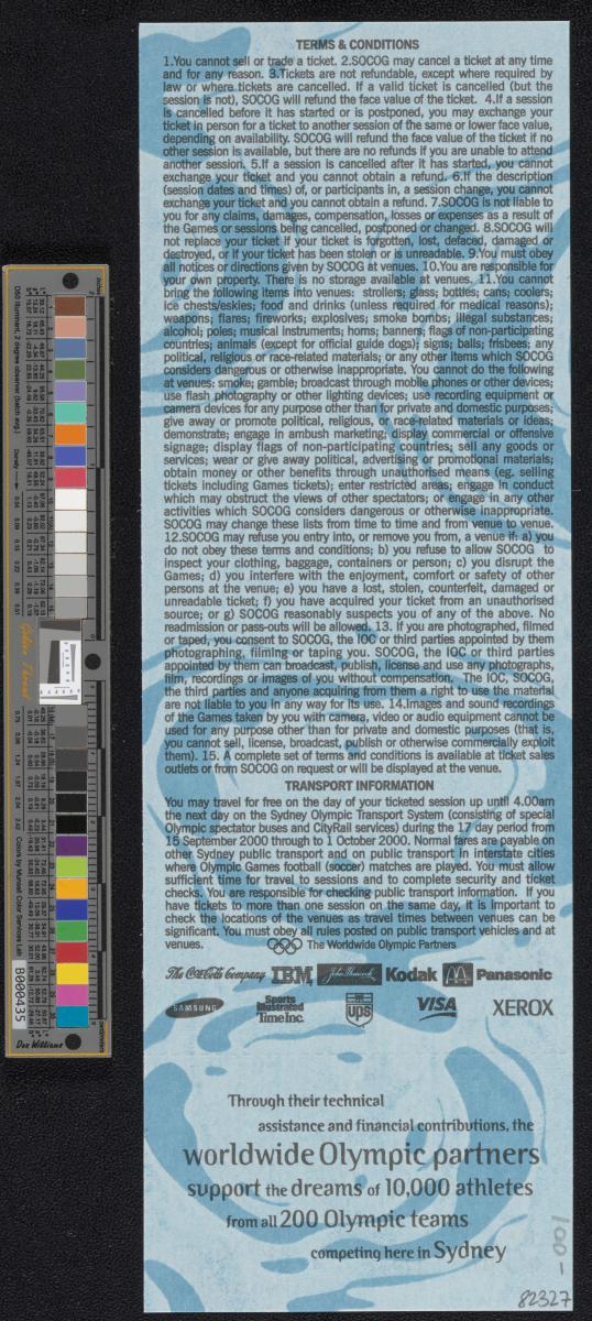 Admission ticket with the Games emblem and pictogram of the sport. Place and location of the seat. On the back conditions and list of top sponsors.