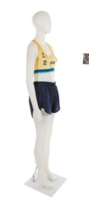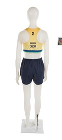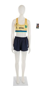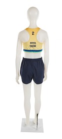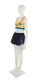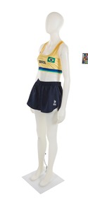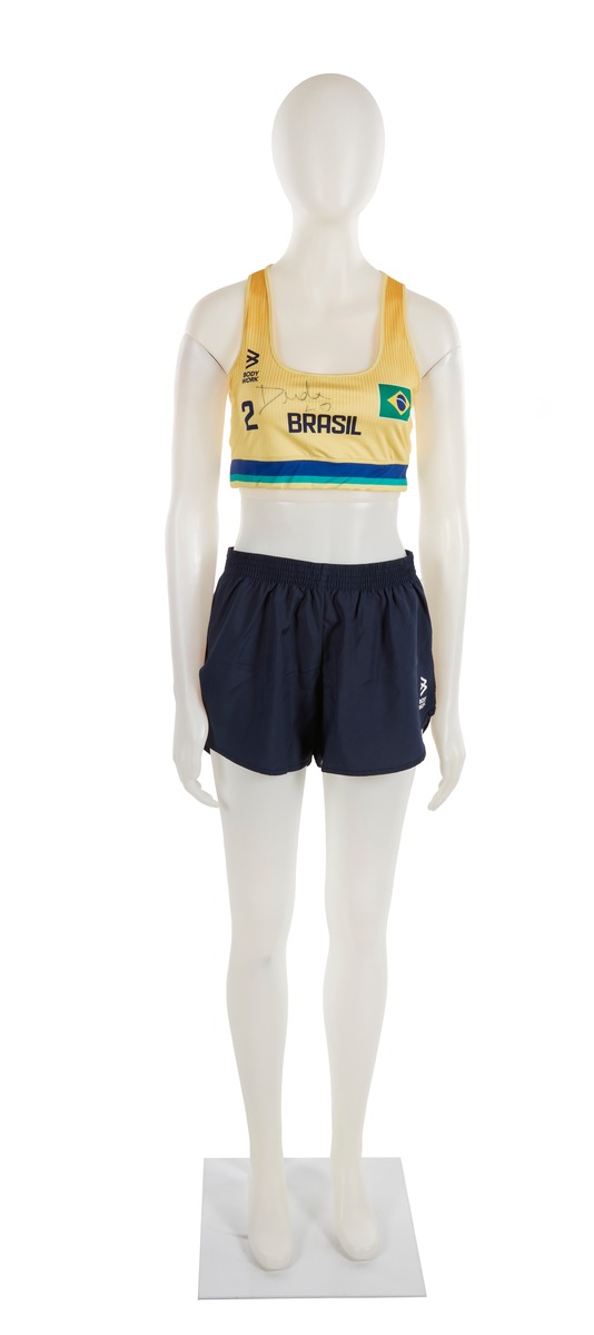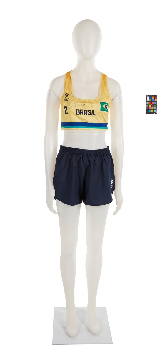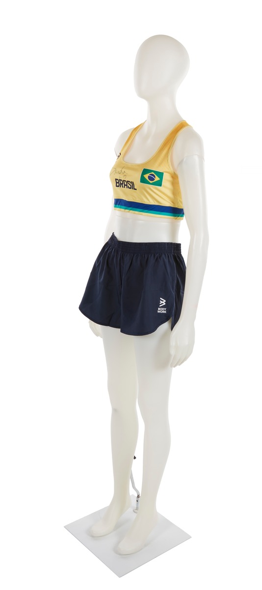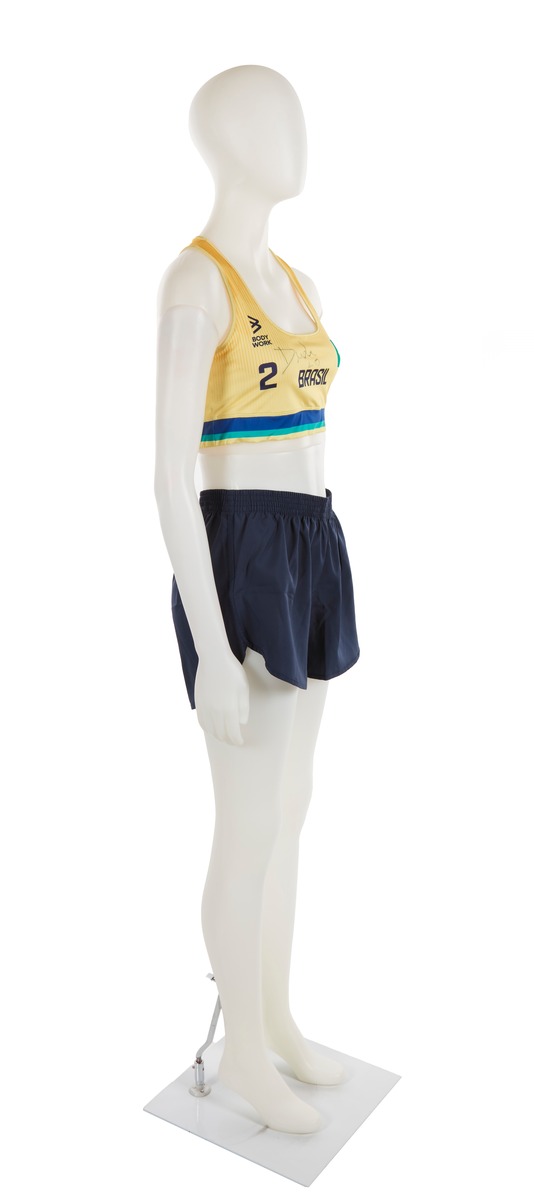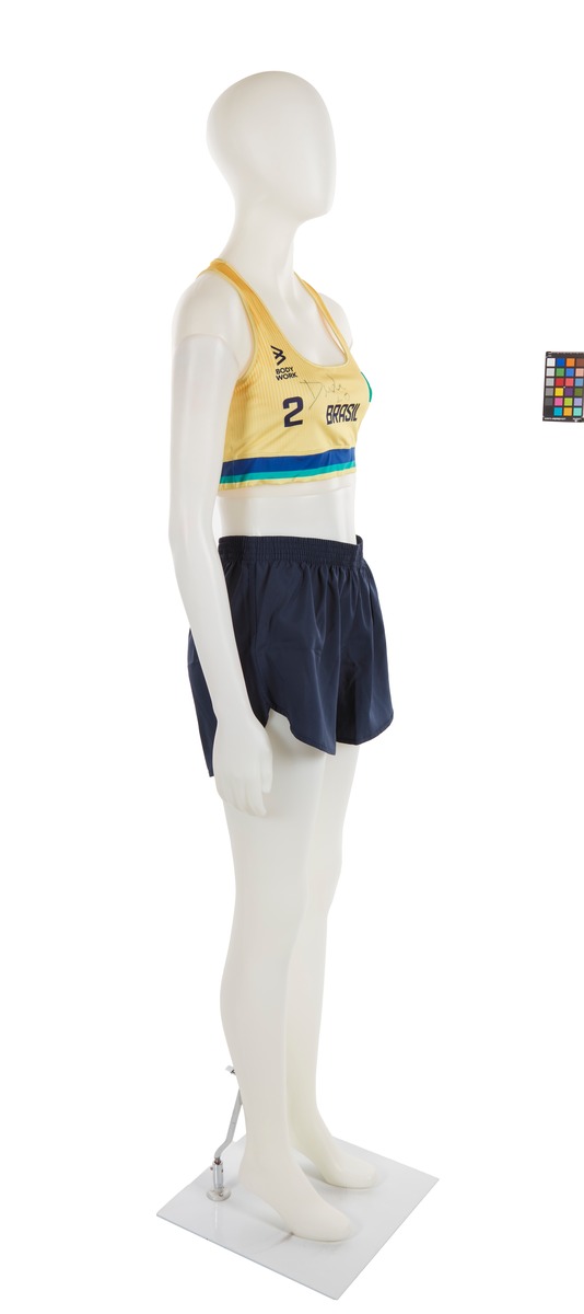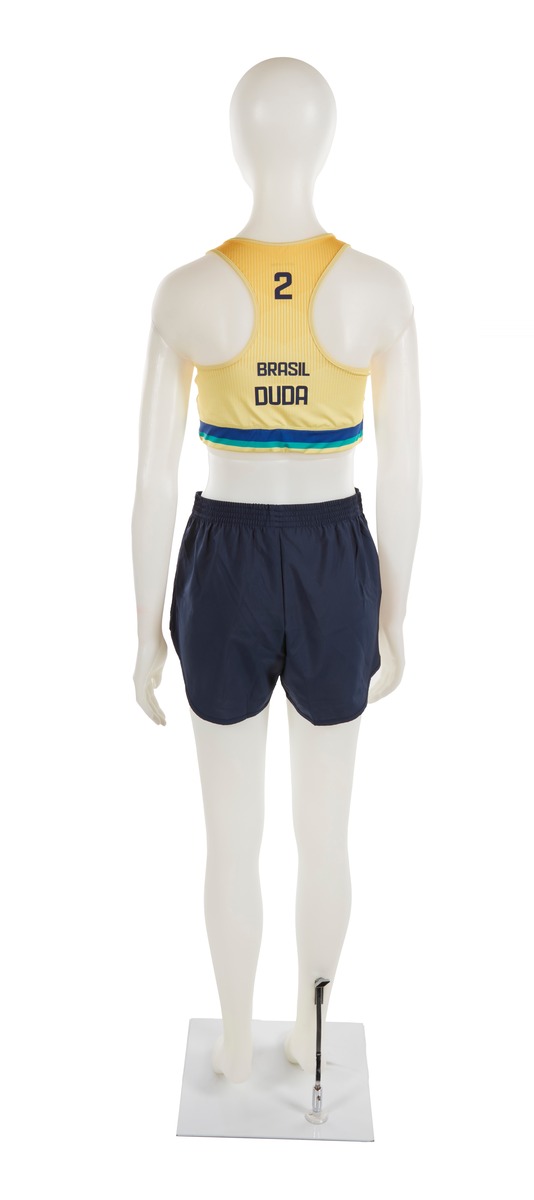 The jumpsuit consists of 2 elements: a top and a pair of sports shorts. The top is in Brazilian colors (yellow, blue and green). The heart features the Brazilian flag and on the other side, the ‘Body Work’ brand. In the middle, the name of the country written in large black letters, the number 2 and the athlete's signature embellished with a small heart. At the back, the number 2, the name of the country and the name DUDA (the athlete's nickname). We can also see a gradient, from orange to yellow. The shorts are plain black, with the brand logo on the left thigh in white.