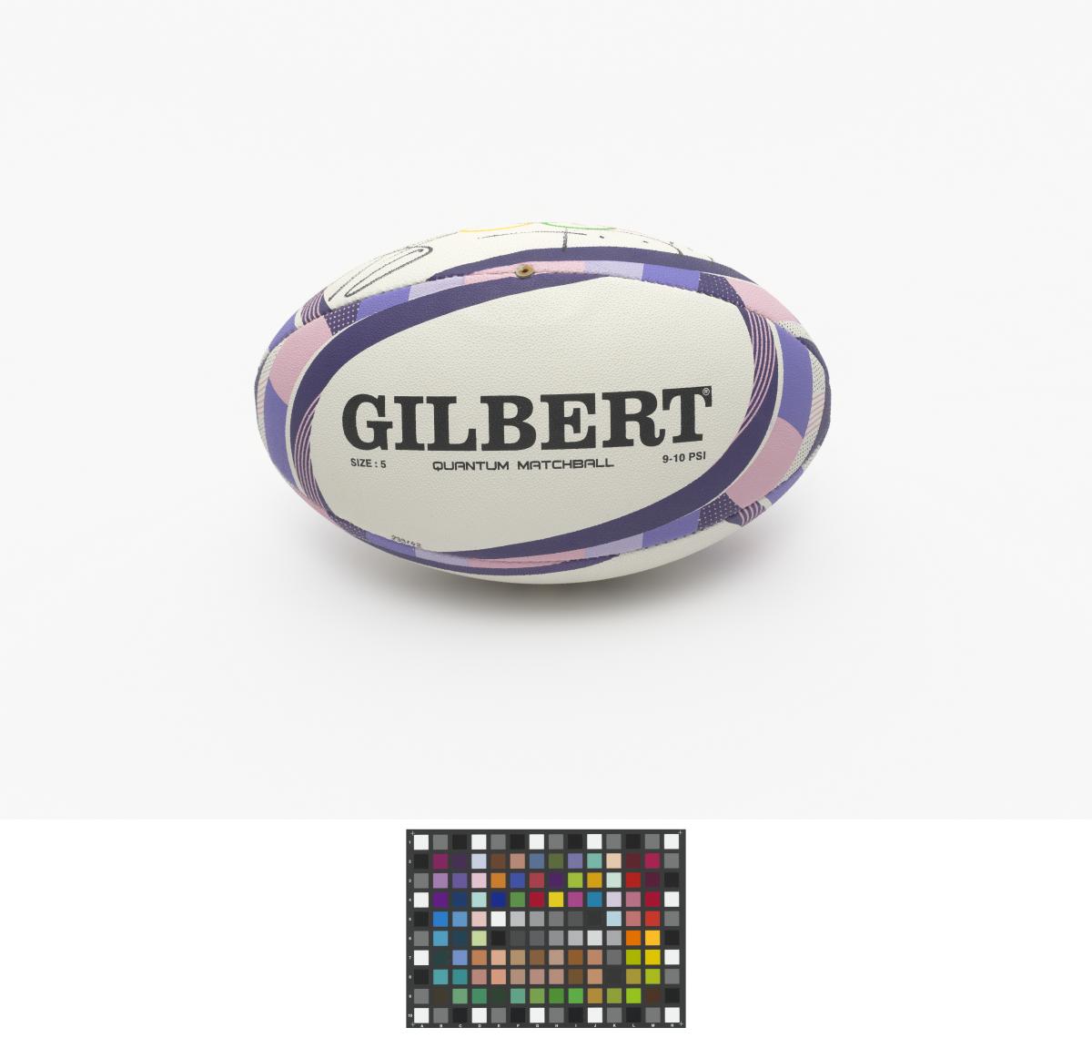 Official rugby ball with the Federation emblem, "Paris 2024" and the Olympic symbol. Size 5. Model: Quantum Matchball 9-10 PSI. Signatures: Risi Pouri-Lane for the New Zealand team and Olivia Apps for the Canadian team.