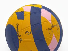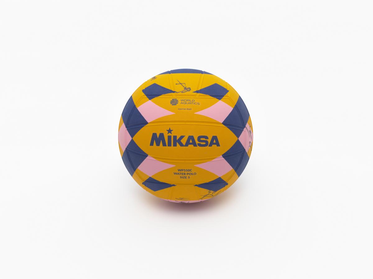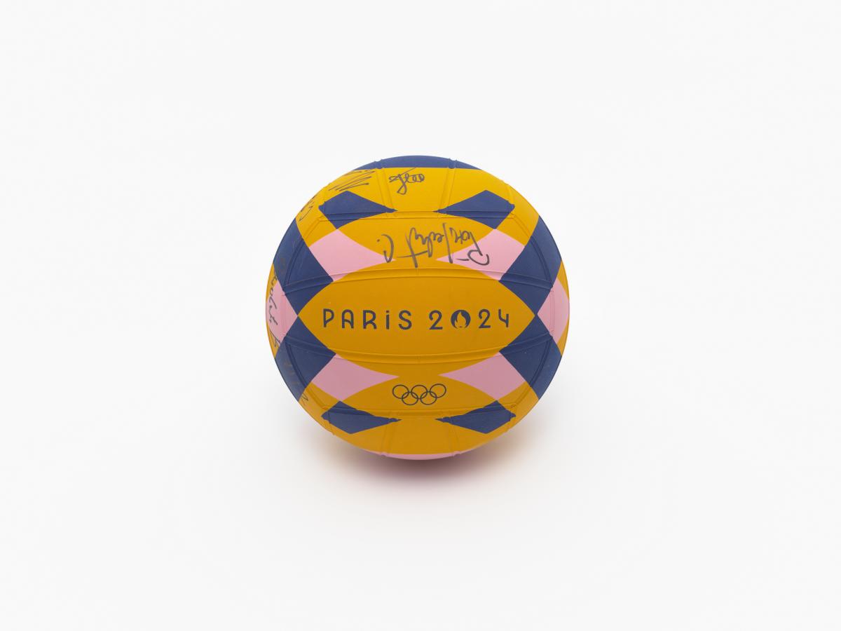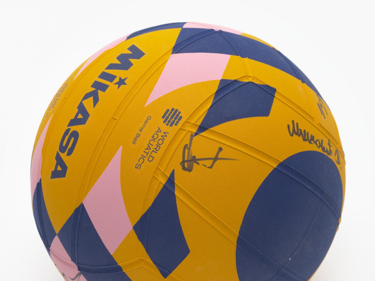 Ball size 5, model WP550C, FINA certified, with the Olympic symbol and the inscription "PARIS 2024". Signed by the male team of Serbia, Olympic champion. Official ball with striated surface.