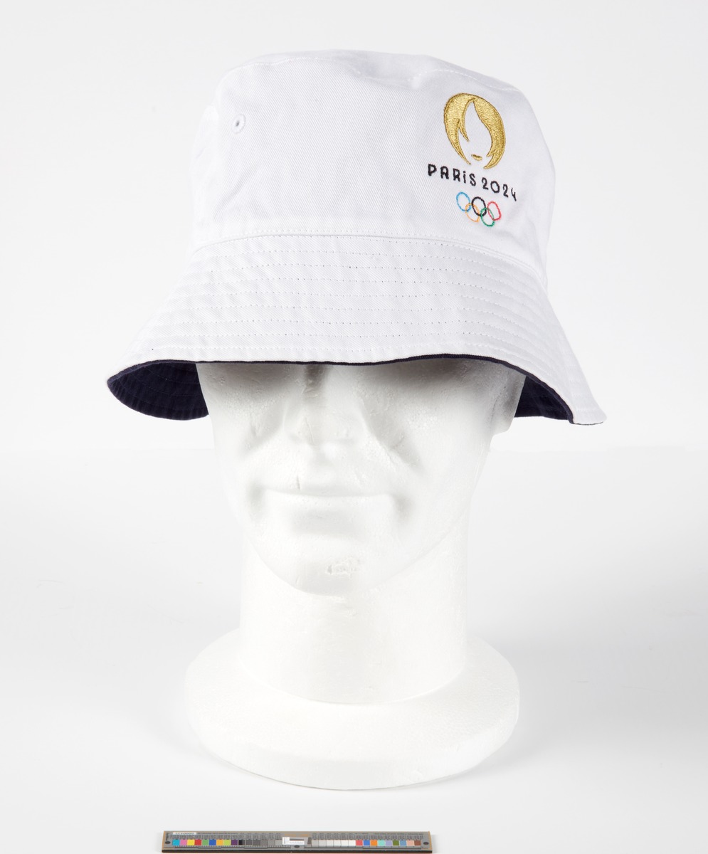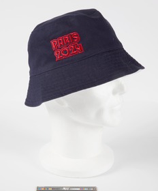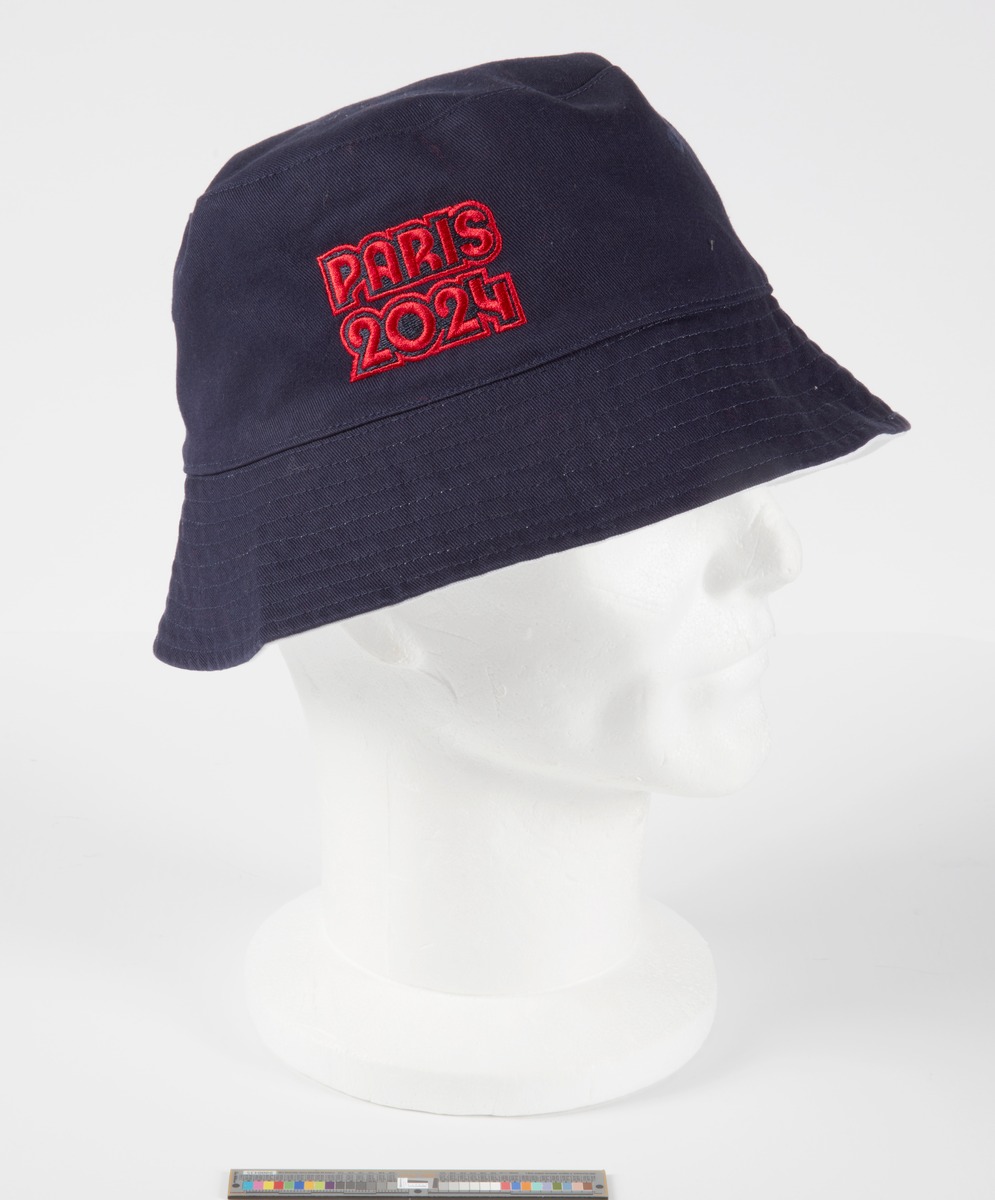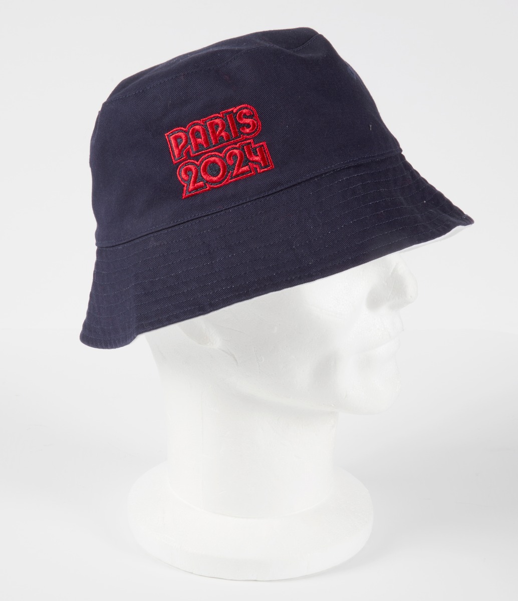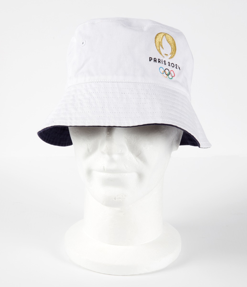 Reversible bob: on one side, blue with the words Paris 2024 in red. On the other, white with the Paris 2024 logo and the Olympic rings.
