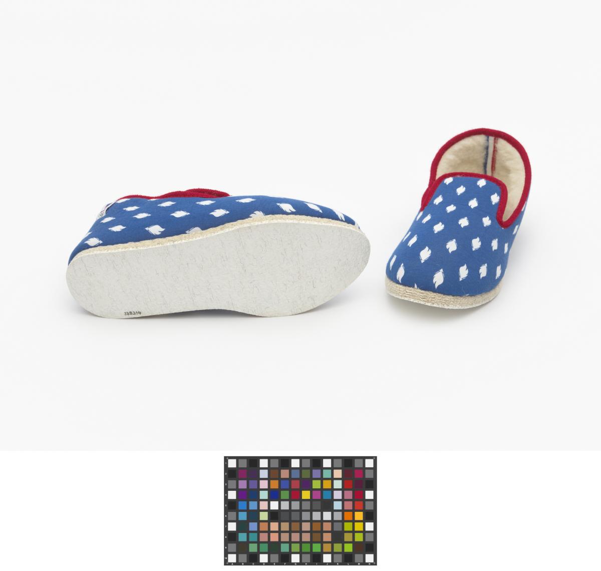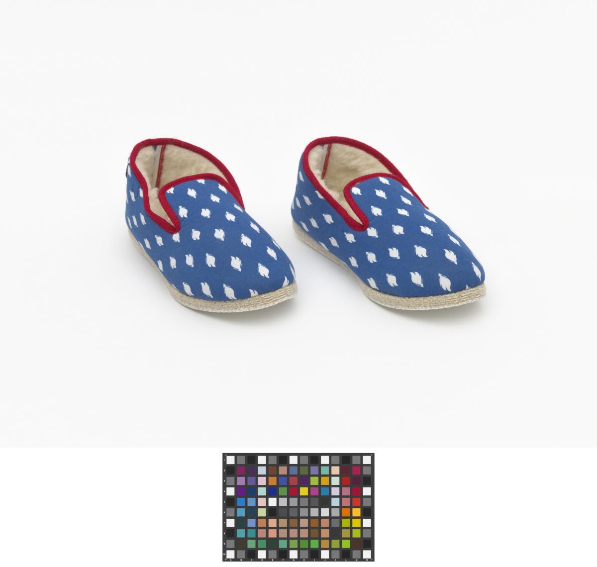 Pair of charentaises slippers bearing the emblem of the French Olympic team. Wool padding, majority wool soles with non-slip coating. French colours on the inside heel seam. Size 41.