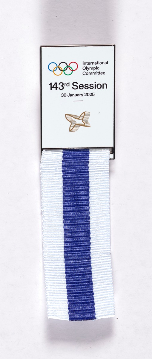 Caption: "International / Olympic / Committee /143rd Session / 30 January 2025" with the Olympic symbol and the symbol of the Olympic House. White-blue-white ribbon.