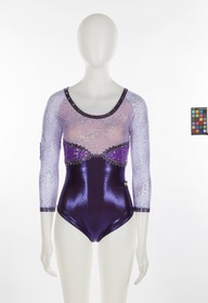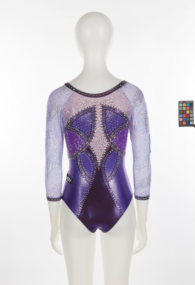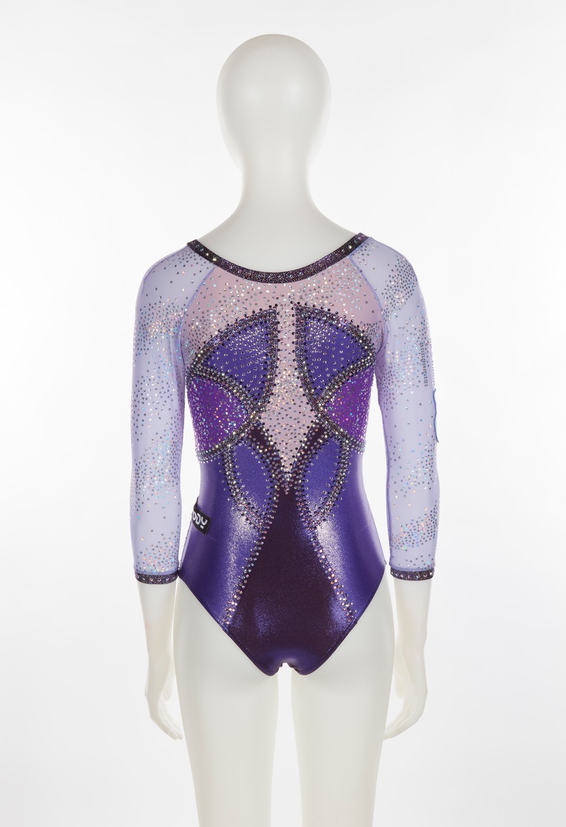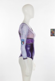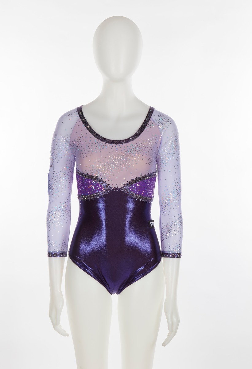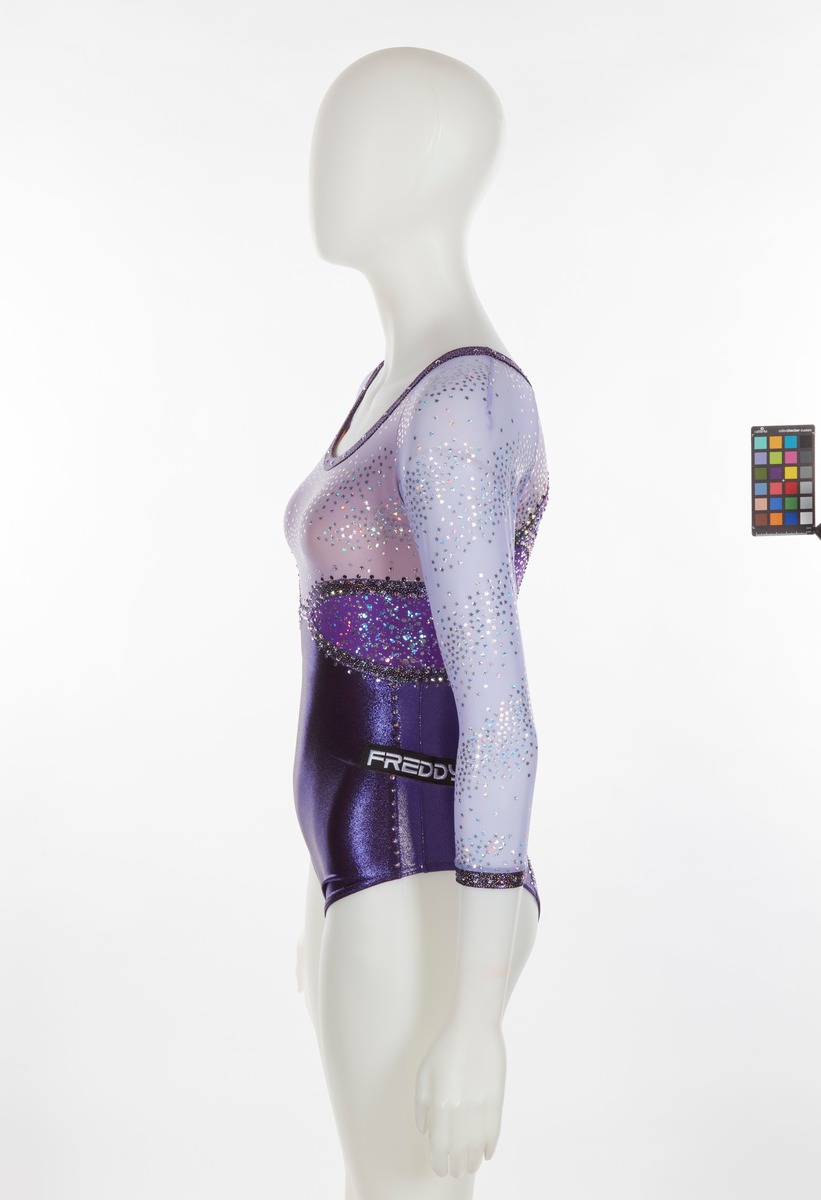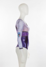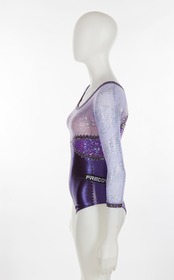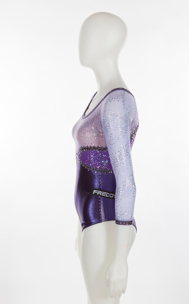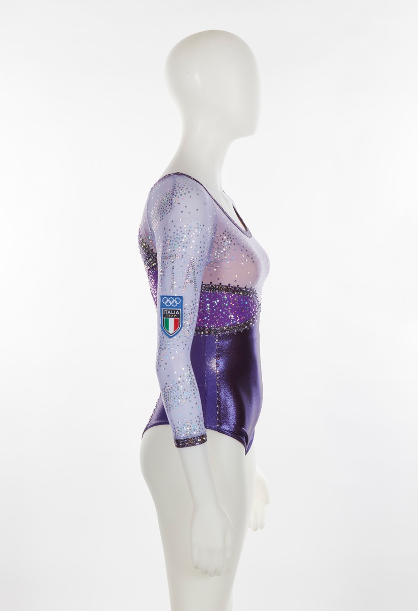 Purple and lilac leotard with glitter and sequined stars. Italian team crest on the right arm. One size fits all.