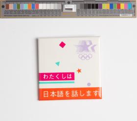 Square badge of an interpreter with the emblem and Look of the Games. Caption: ‘I speak / Japanese’ (in Japanese).