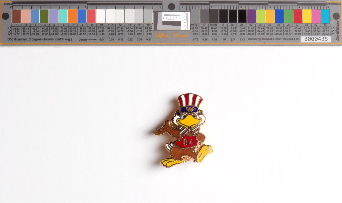 Los Angeles 1984, commemorative badge with Sam the Eagle, the Games mascot, greeting the public.
