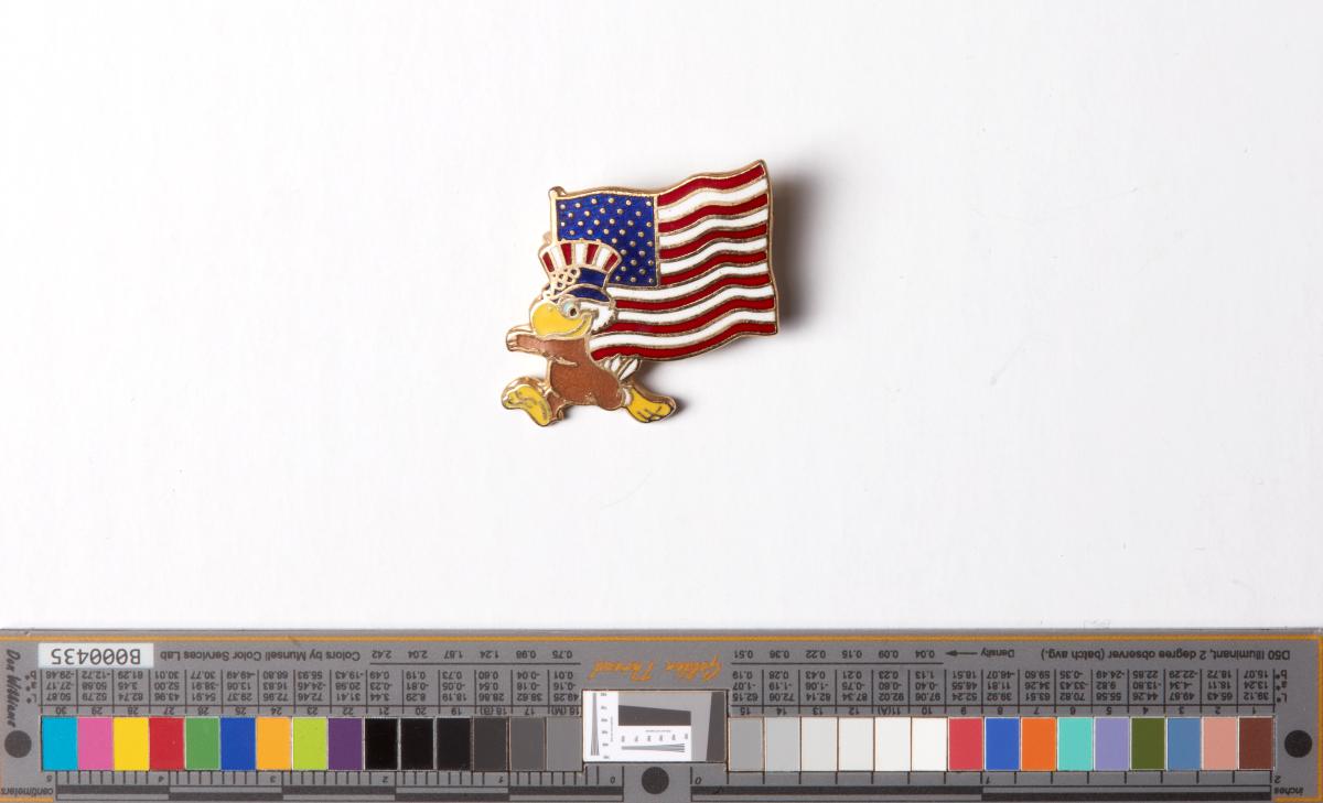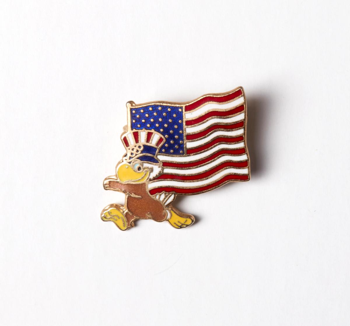 Badge with Sam the Eagle, the Games mascot, carrying the US flag.