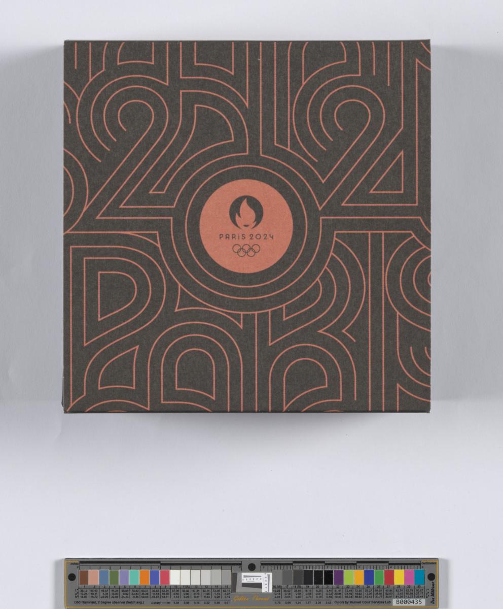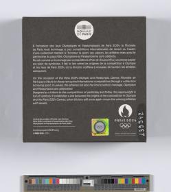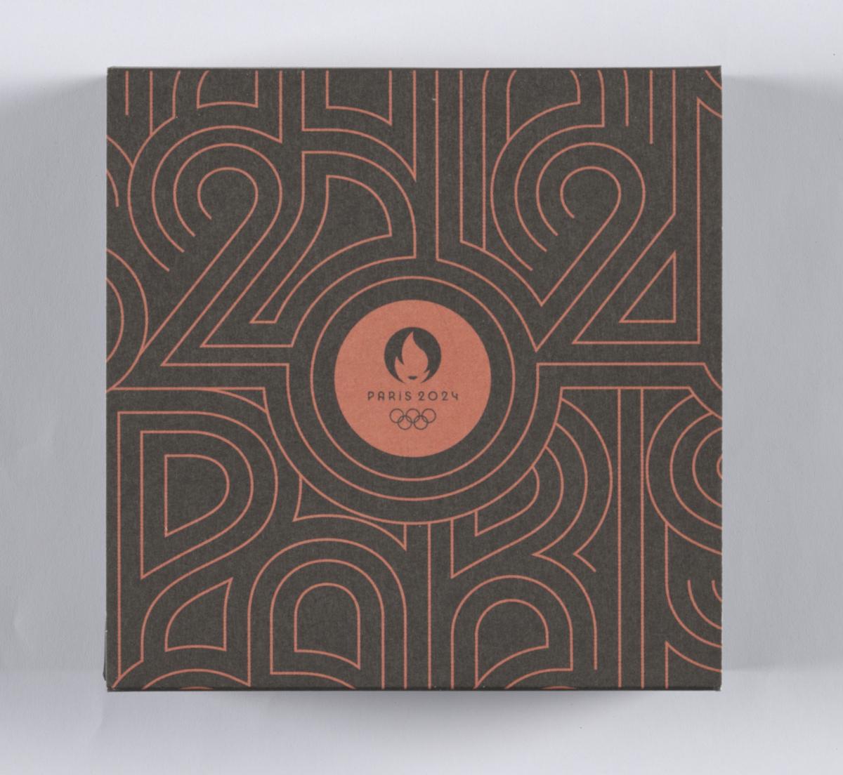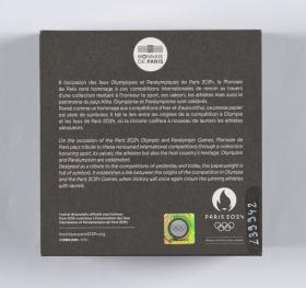 The engraving shows an ancient athlete throwing a discus, a tribute to the ancient Games. Next to him, a modern runner wearing the emblem of the Paris 2024 Olympic Games on her shirt crosses a finishing line. Niké, the Goddess of Victory, sits on the Arc de Triomphe and crowns the victorious athlete with laurels. In the background is a Parisian landscape. You can see the Eiffel Tower and the Arc de Triomphe, as well as Haussmann buildings. A map of Paris can also be seen in the background. Caption: ‘JEUX DE LA XXXIIIe OLYMPIADE PARIS 2024’.