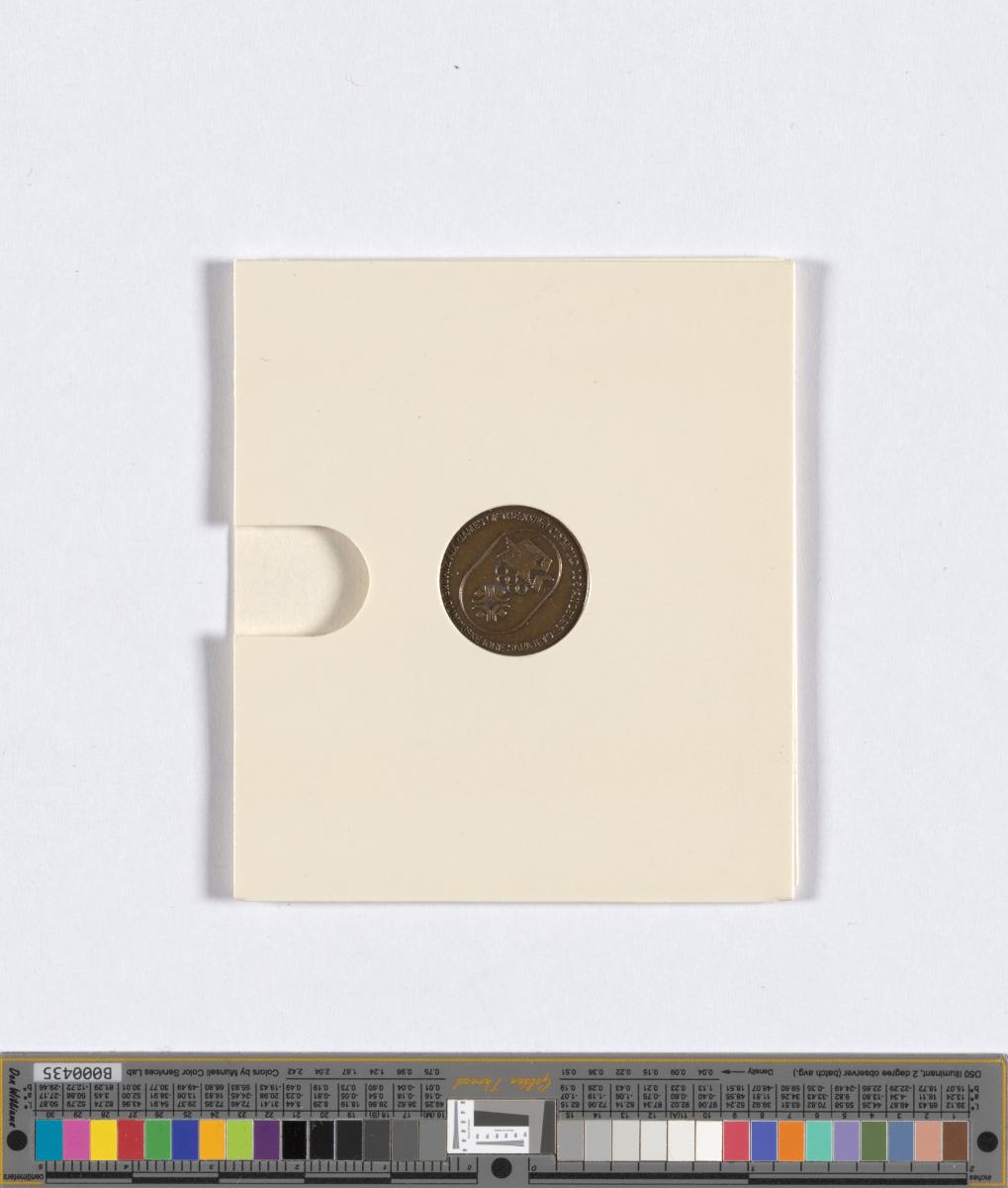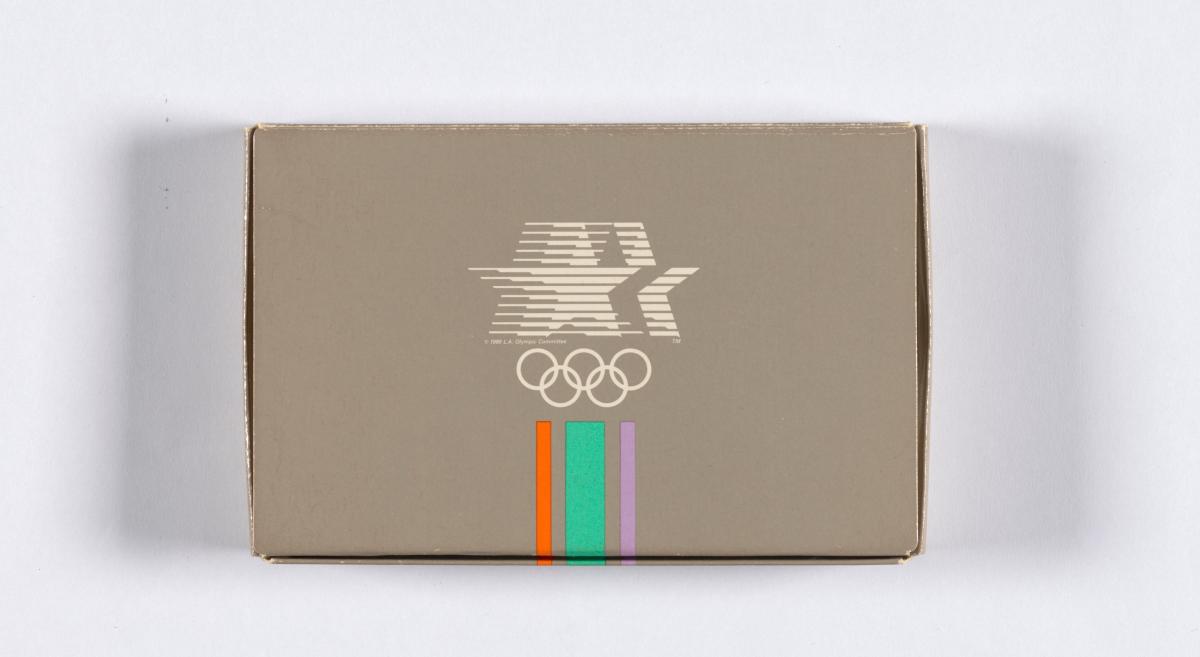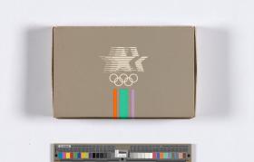 Cardboard box with the emblem of the 1984 Los Angeles Games, containing: 1) a badge with the emblem of the 1984 Los Angeles Games. 2) A medallion with on the obverse a dove of peace, along with the Olympic Symbol and torch, caption: "1984 / SARAJEVO - LOS ANGELES‘. On the reverse are the combined emblems of the 1984 Sarajevo and Los Angeles Games, with the caption: ’GAMES OF THE XXIIIrd OLYMPIAD LOS ANGELES; XIV ZIMSKE OLIMPIJSKE IGRE SARAJEVO".