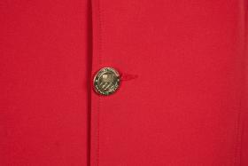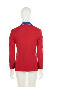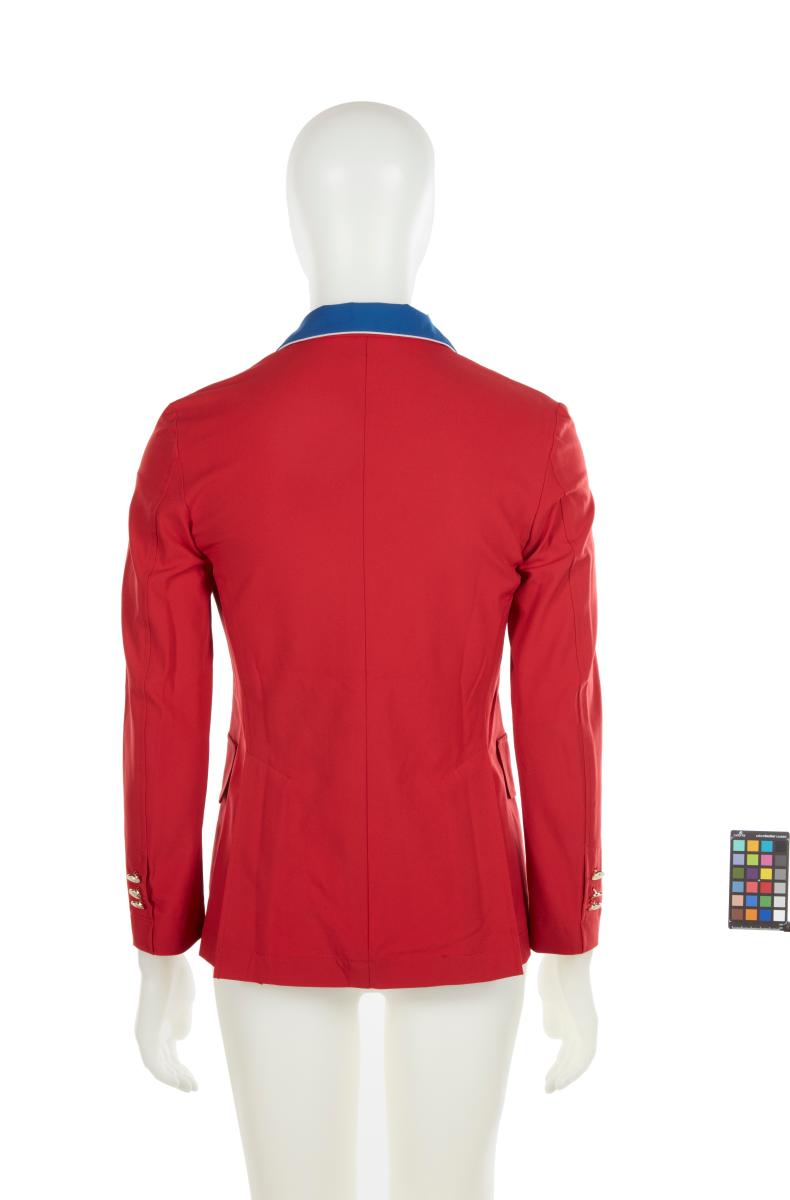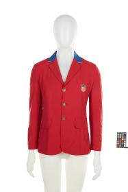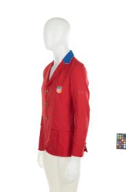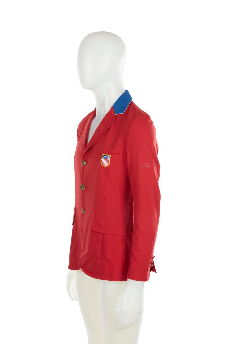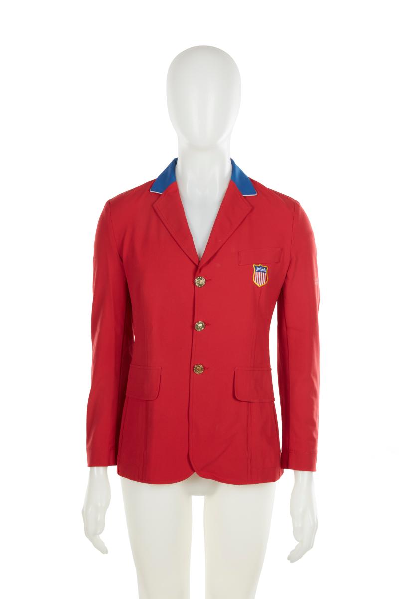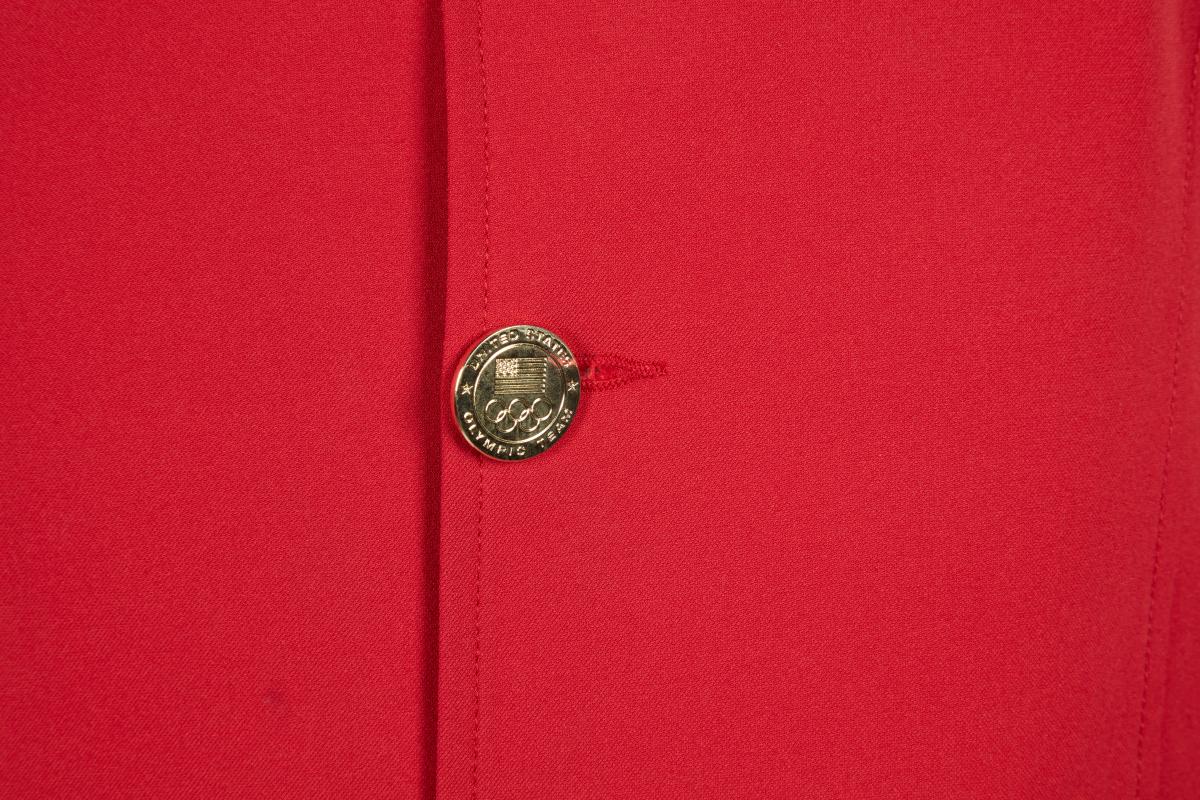 Red jacket with blue collar. United States crest on the chest, gold buttons and cufflinks with the emblem of the United States Olympic team.