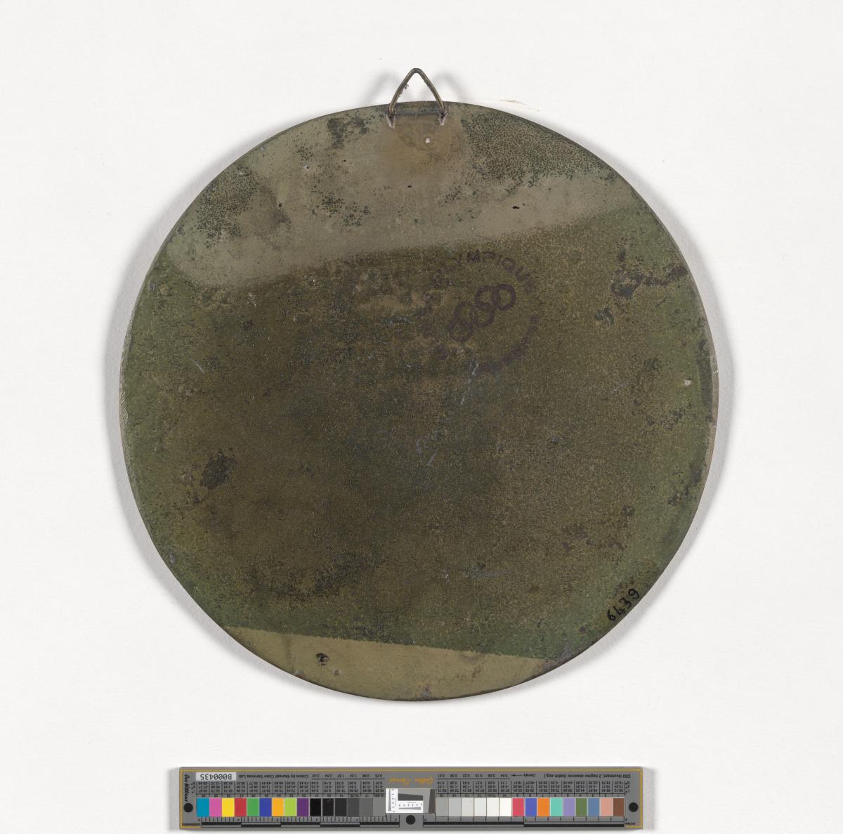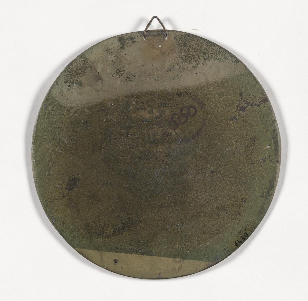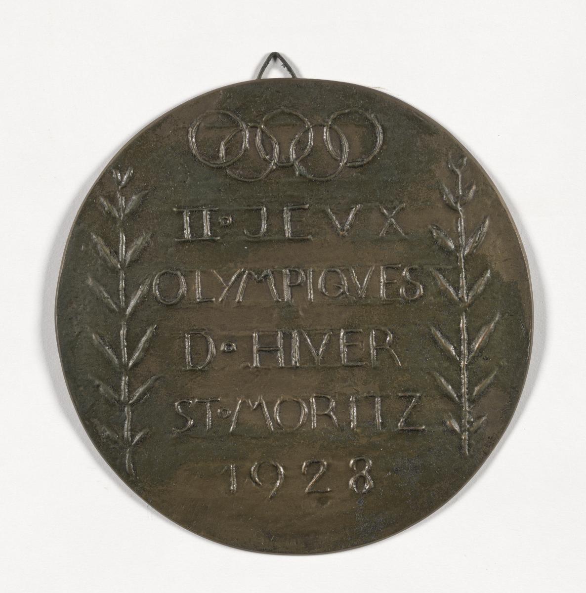 Round wall ornament with a hook, reproducing the reverse of the Games winner's medal: Olympic symbol above the caption: "II JEUX / OLYMPIQUES / D'HIVER / ST MORITZ / 1928". Olive branches on the sides.