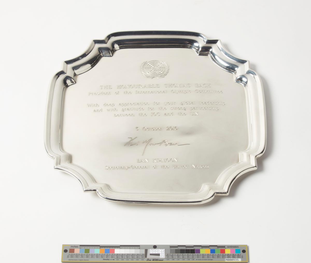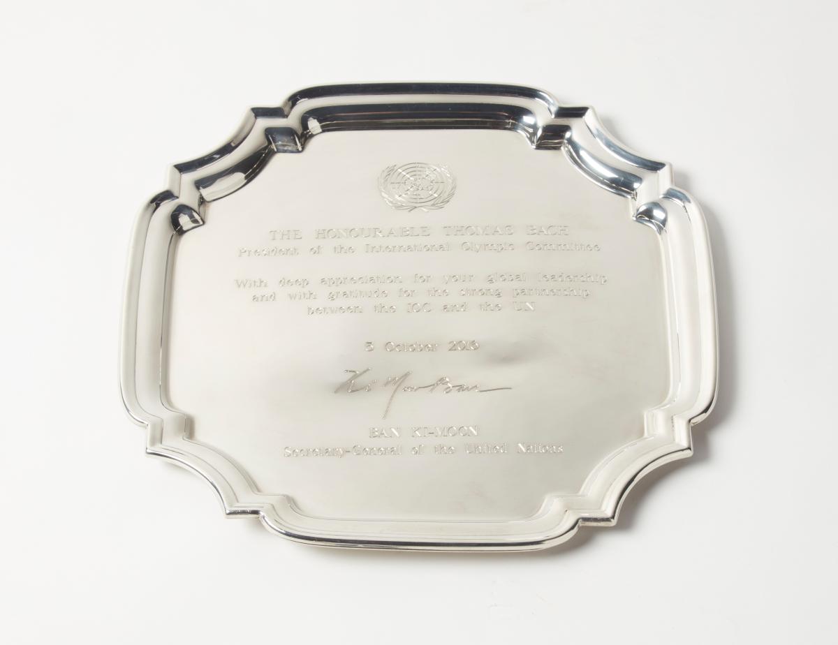 Silver plate with the United Nations logo. Caption: "THE HONORABLE THOMAS BACH / President of the International Olympic Committee / With deep appreciation for your global leadership / and with gratitude for the strong partnership / between the IOC and the UN / 5 October 2016 / BAN KI-MOON / Secretary-General of the United Nations".