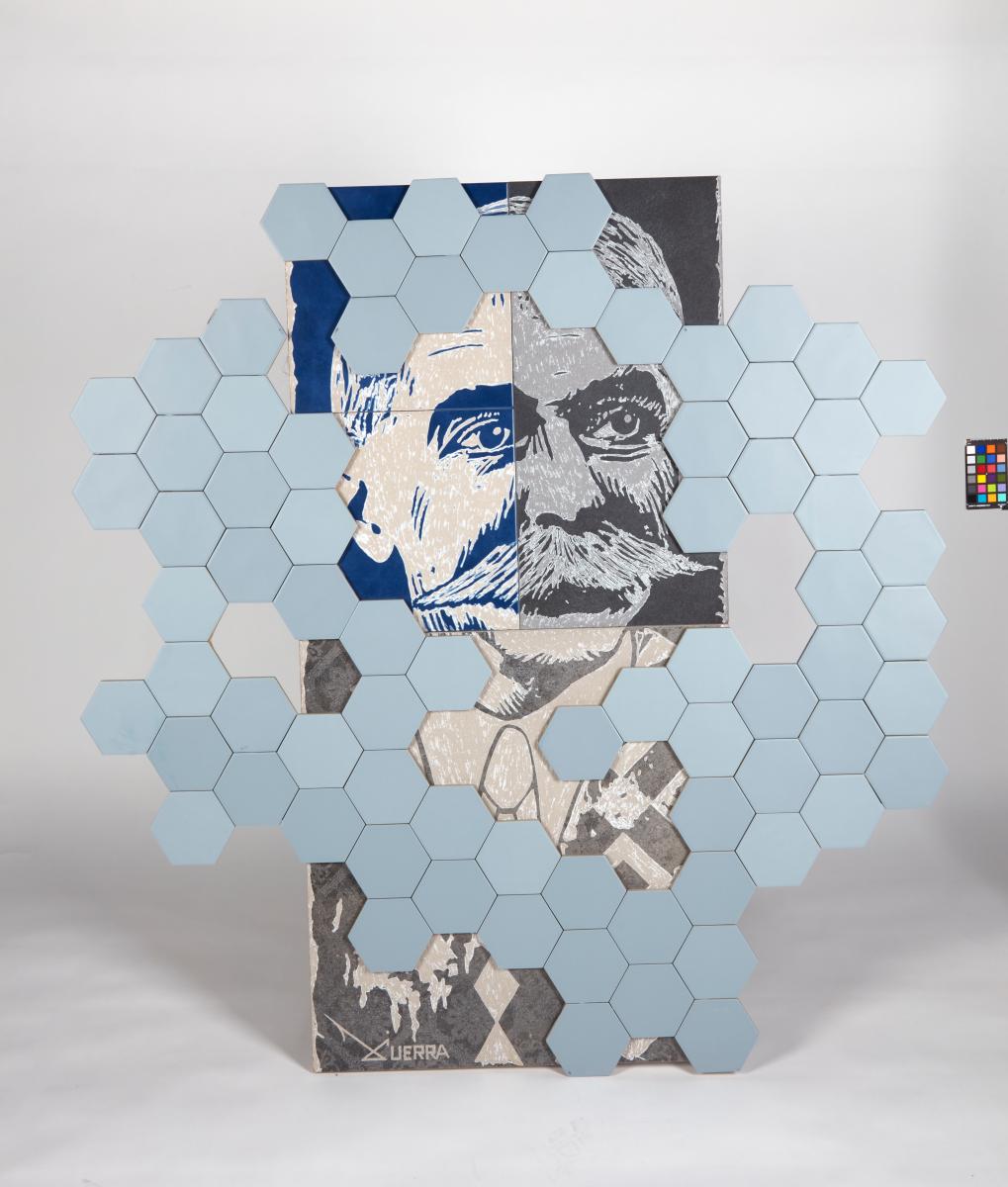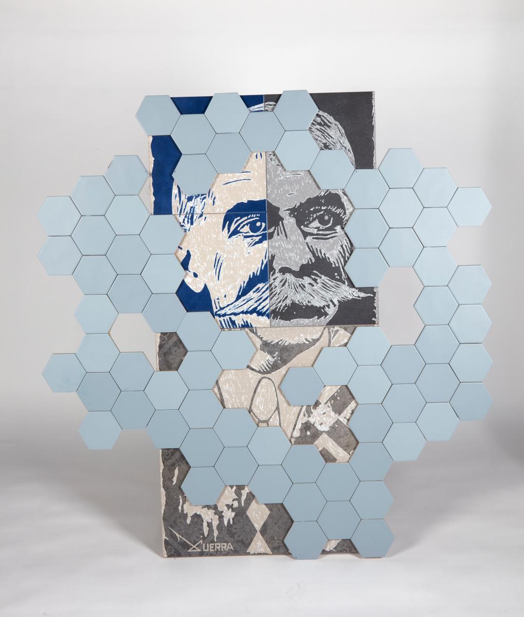 Ceramic engraving depicting Pierre de Coubertin with hexagonal ceramics. Signed by the artist.