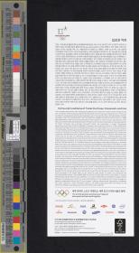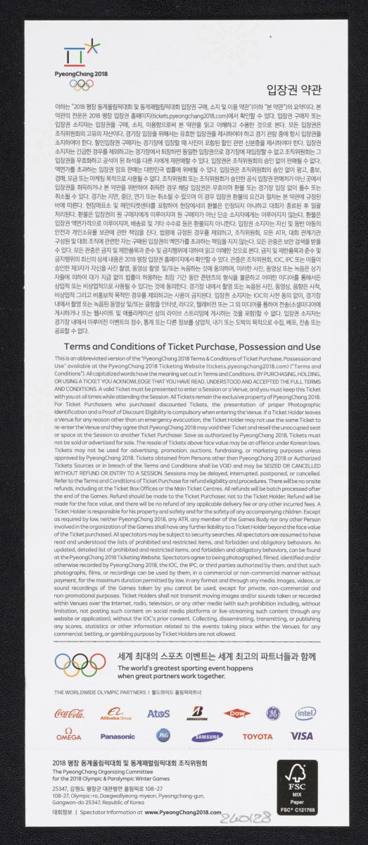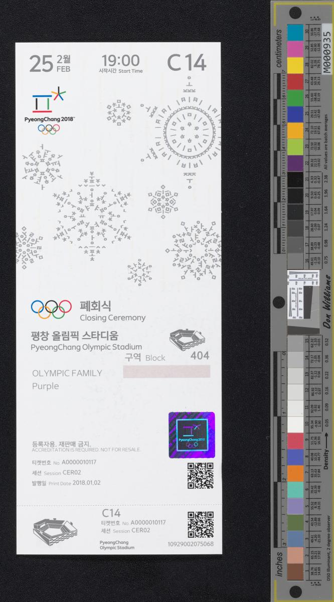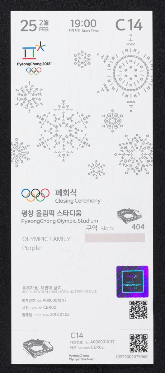 Recto: snowflakes composed by Korean alphabet letters, Games emblem. Text in English: "Closing Ceremony / PyeongChang Olympic Stadim / Block 404 / Olympic Family / Purple", date, hour and number of category. Hologram. Verso : terms and conditions of ticket purchase and use, logos of TOP sonspors. Printed on FSC paper.