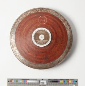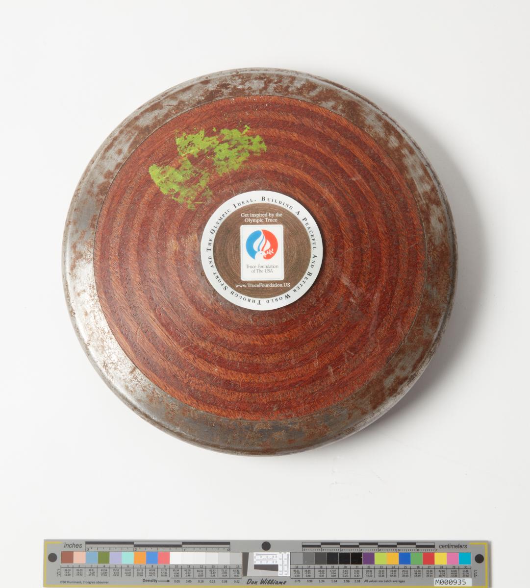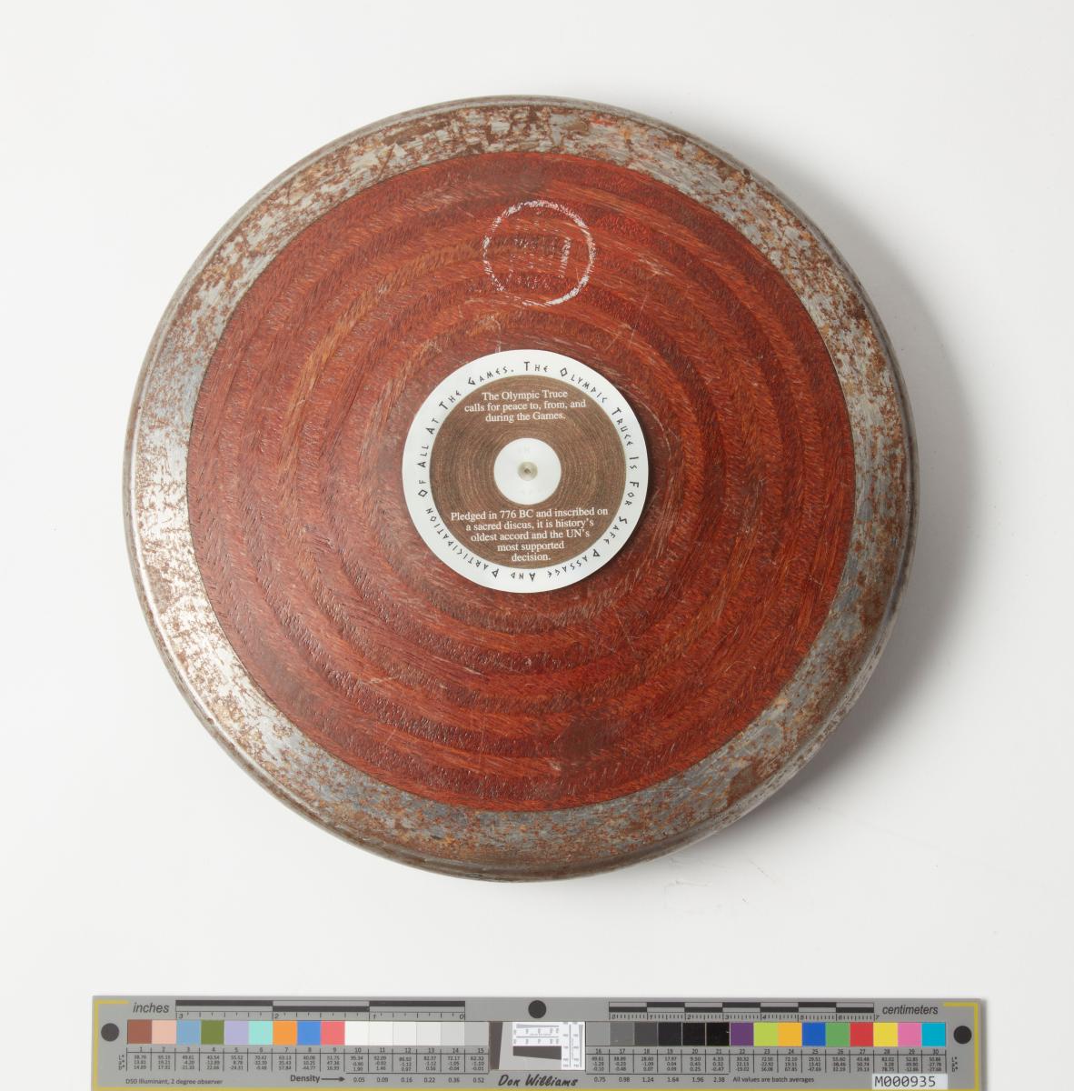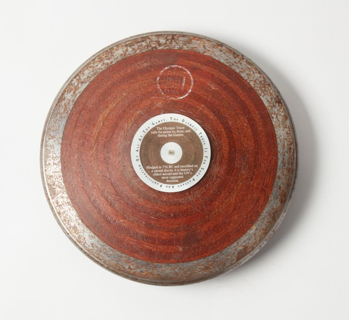 Wooden disc with iron rim. Side A: medallion in the centre with the Olympic Truce emblem, inscriptions: ‘Building A Peaceful And Better World Through The Olympic Ideal’; ‘Get inspired by the / Olympic Truce’. Side B: medallion in the centre with the inscriptions: ‘The Olympic Truce Is For Safe Passage And Participation Of All At The Games’; ‘The Olympic Truce calls for peace to, from, and during the Games; Pledged in 776 BC and inscribed on a sacred discus, it is history's oldest accord and the UN's most supported decision’.