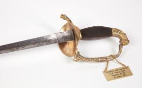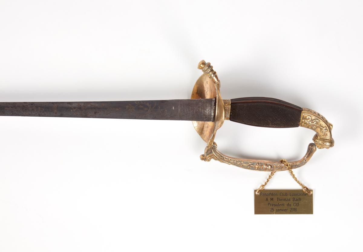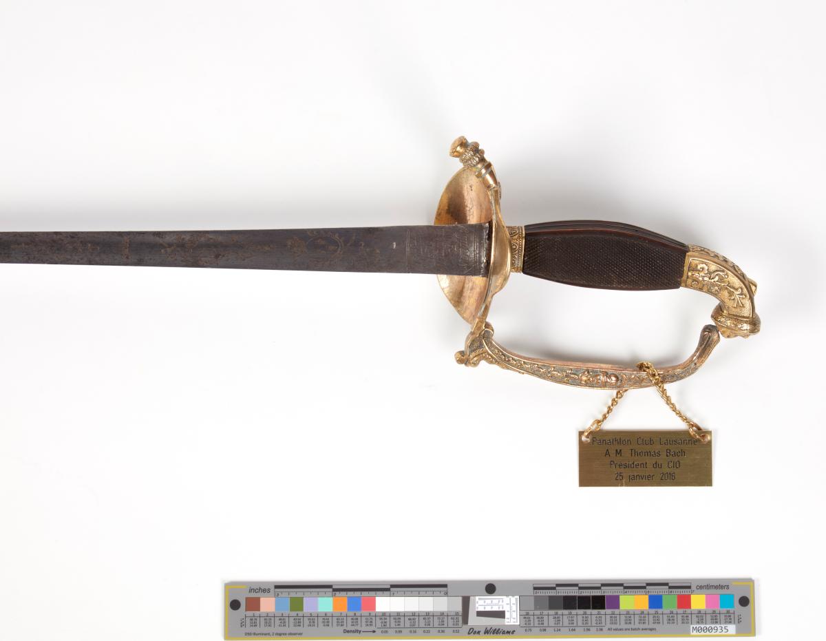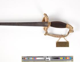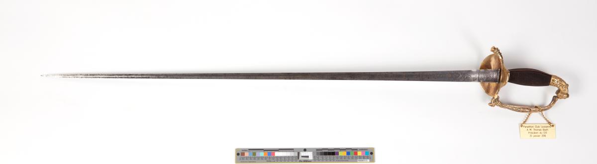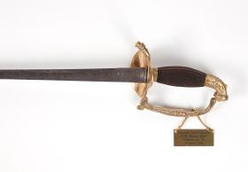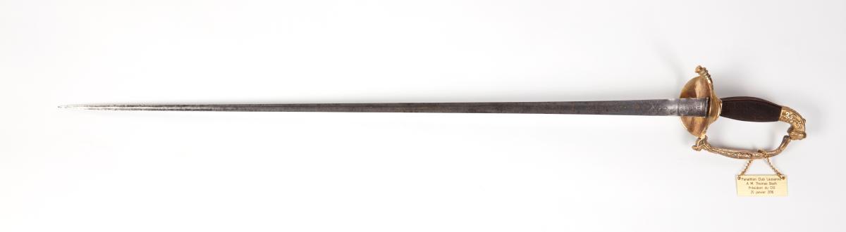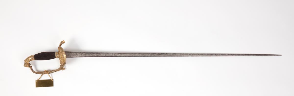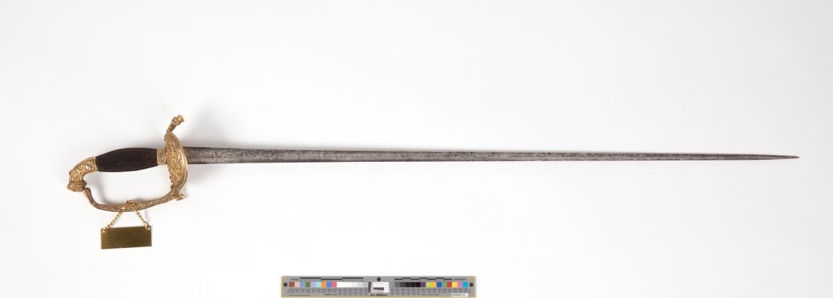 Flat triangular blade decorated with plant motifs and the coat of arms of the Kingdom of France. Blade signed: ‘Guilmin Md Fourbisseur à Versailles’. Guard decorated with a lion on ancient arms. No scabbard.