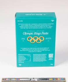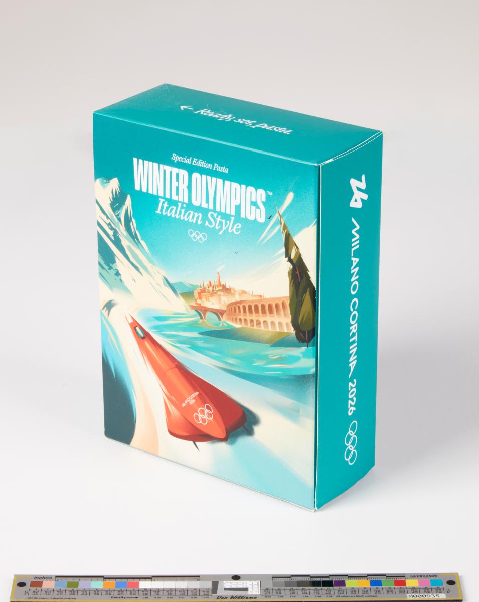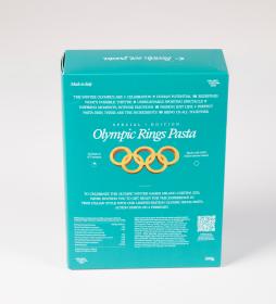 Rectangular box with a boblseigh in front of a view of Verona. Contains pasta Olympic symbol-shaped). Text on the back: "The Winter Olympics are a celebration of human potential that redefines what's possible. They're an unbelievable sporting spectacle of inspiring moments, intense emotions and passion. Just like a perfect pasta dish, these are the ingredients that bring us all together. / To celebrate the Olympic Winter Games Milano Cortina 2026, we're inviting you to get ready for the experience in true Italian style with our limited-edition Olympic rings pasta. Action starts on 6 February".