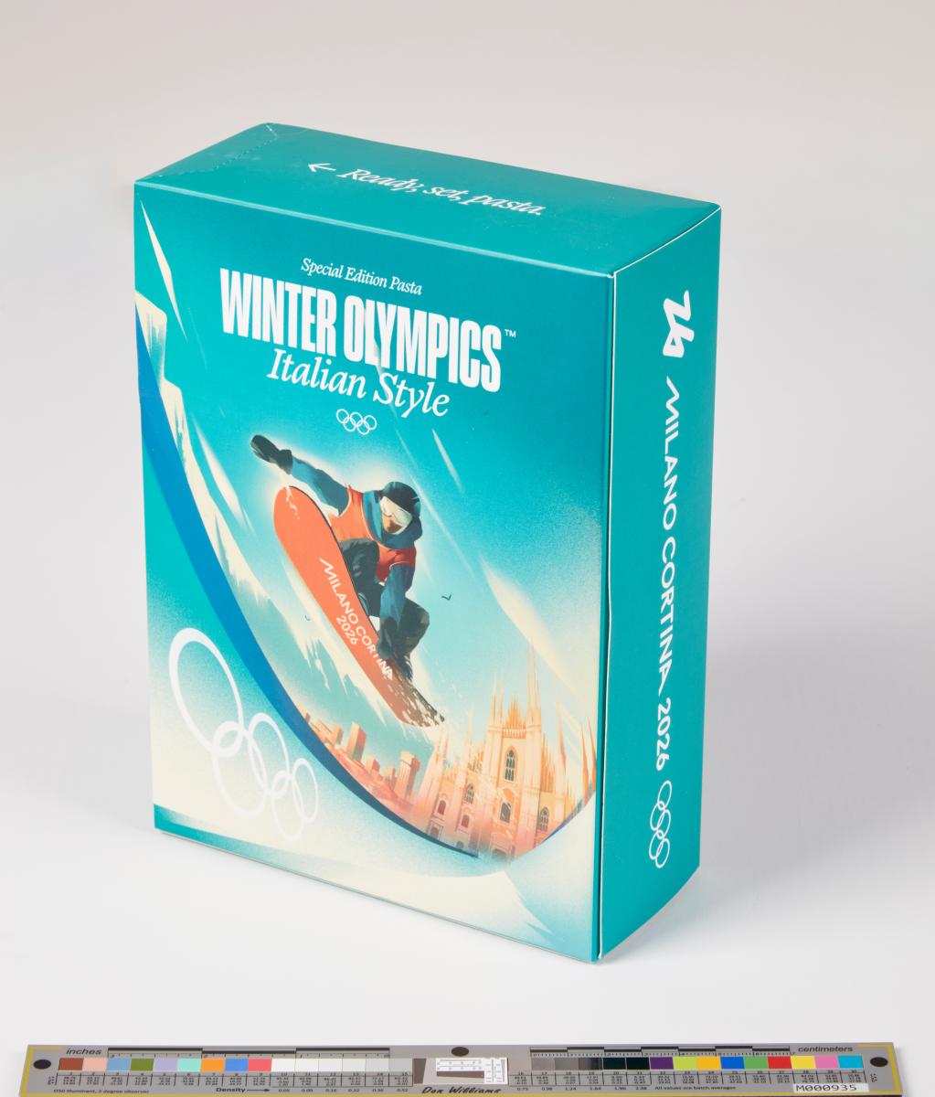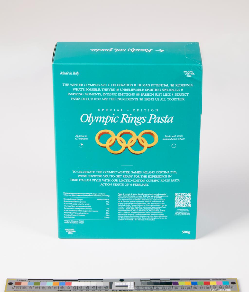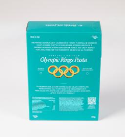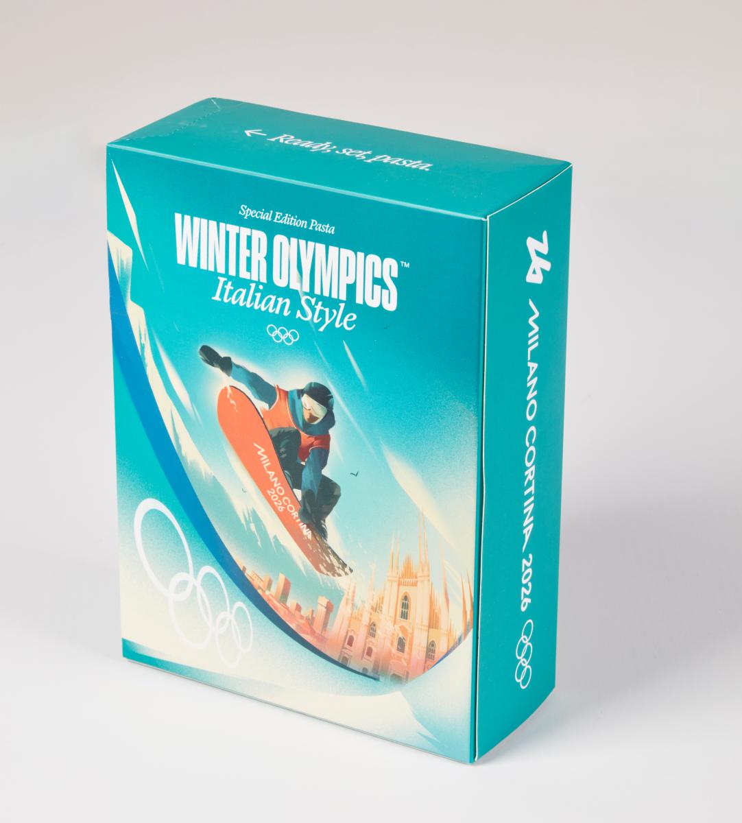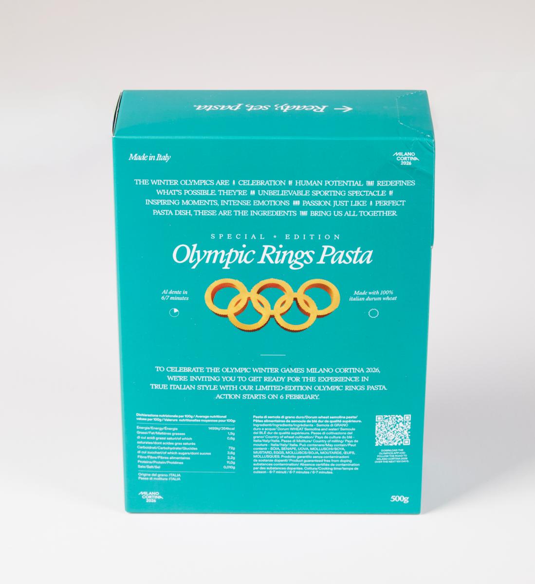 Rectangular box with a snowboarder in front of a view of Milano. Contains pasta Olympic symbol-shaped). Text on the back: "The Winter Olympics are a celebration of human potential that redefines what's possible. They're an unbelievable sporting spectacle of inspiring moments, intense emotions and passion. Just like a perfect pasta dish, these are the ingredients that bring us all together. / To celebrate the Olympic Winter Games Milano Cortina 2026, we're inviting you to get ready for the experience in true Italian style with our limited-edition Olympic rings pasta. Action starts on 6 February".