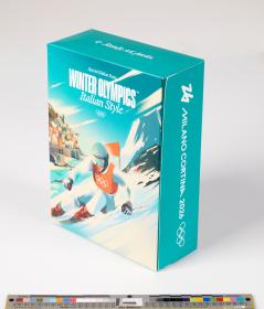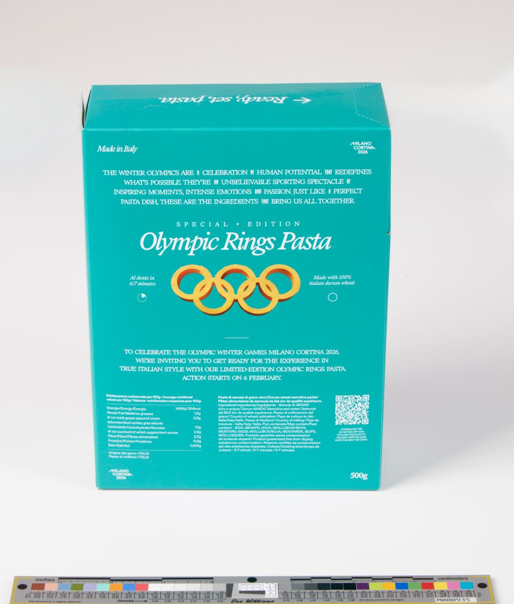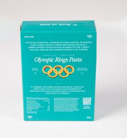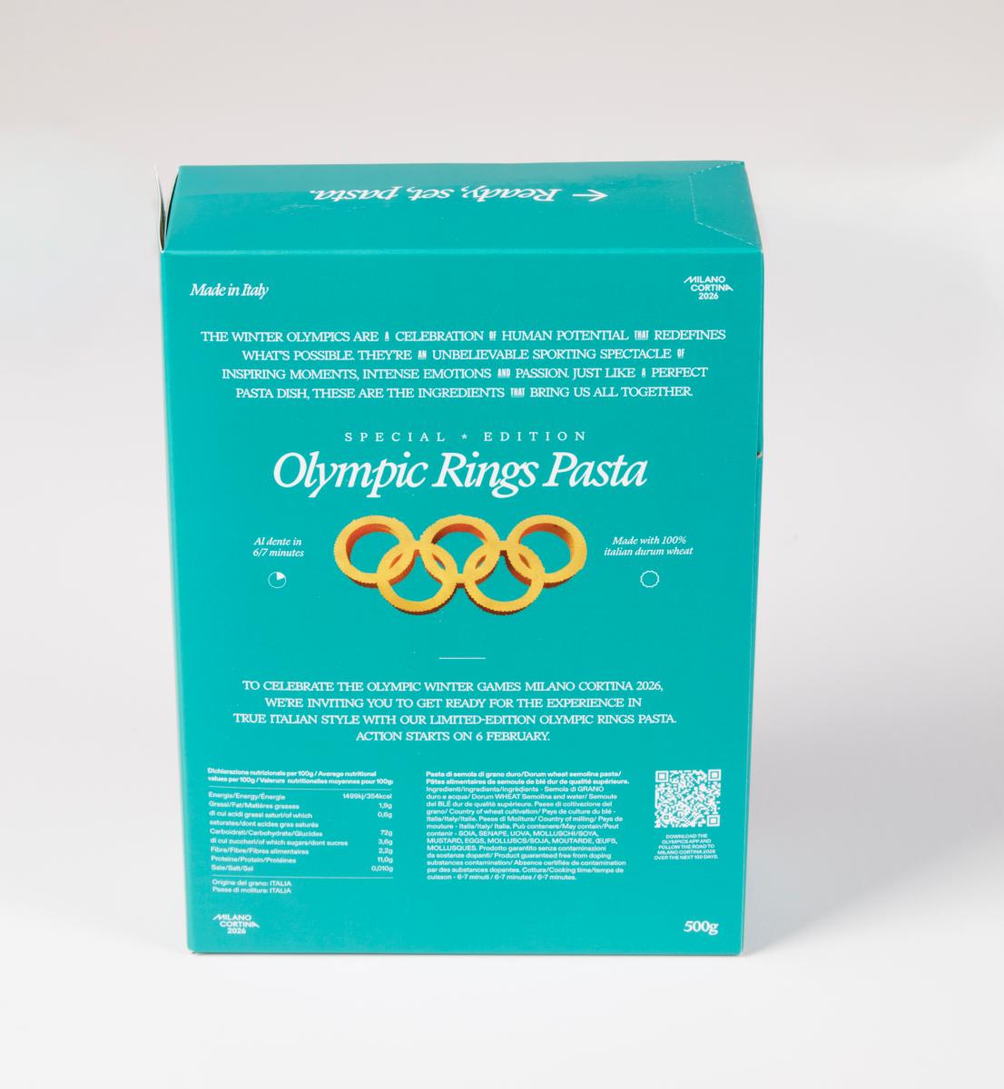 Rectangular box with a skier in front of an Italian village. Contains pasta Olympic symbol-shaped). Text on the back: "The Winter Olympics are a celebration of human potential that redefines what's possible. They're an unbelievable sporting spectacle of inspiring moments, intense emotions and passion. Just like a perfect pasta dish, these are the ingredients that bring us all together. / To celebrate the Olympic Winter Games Milano Cortina 2026, we're inviting you to get ready for the experience in true Italian style with our limited-edition Olympic rings pasta. Action starts on 6 February".