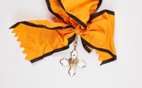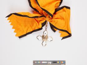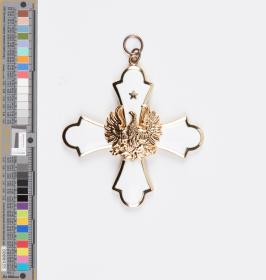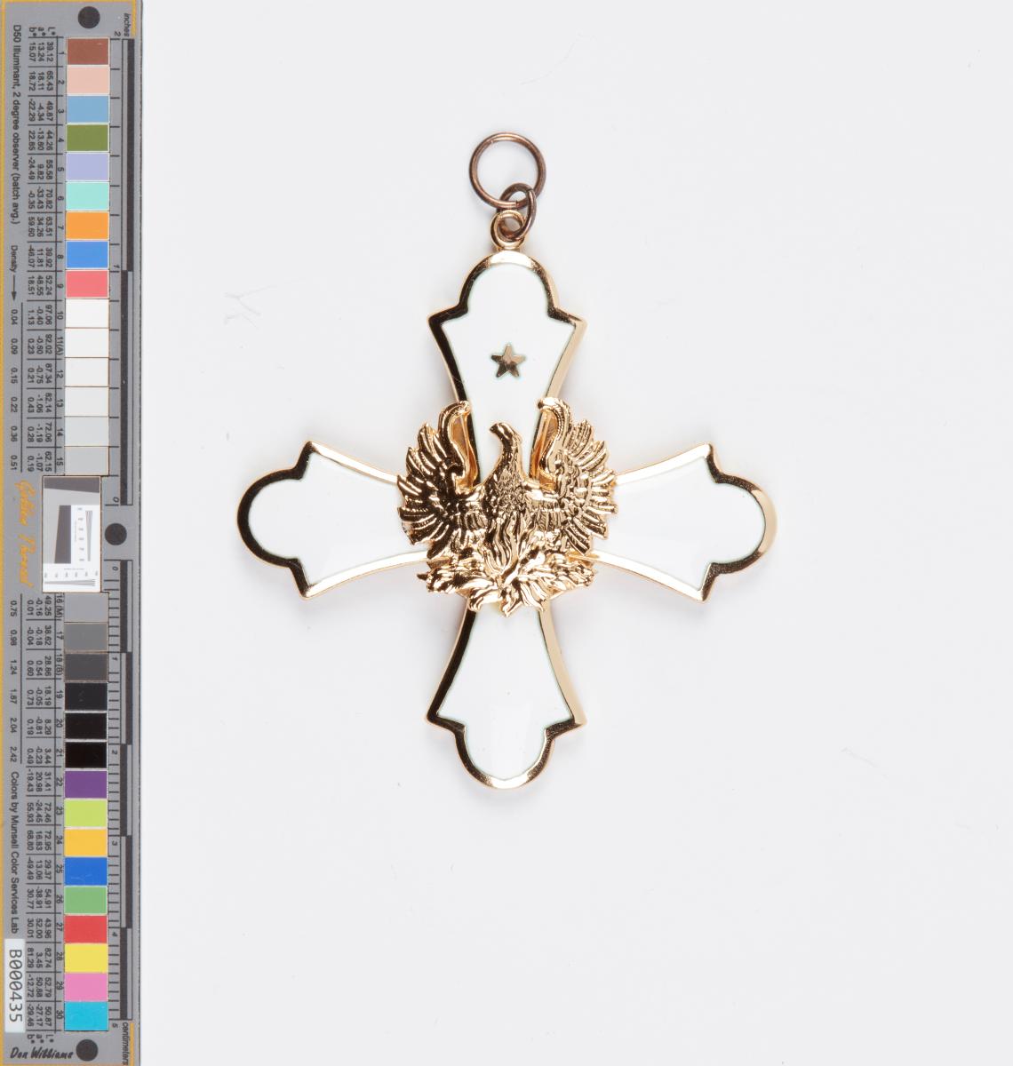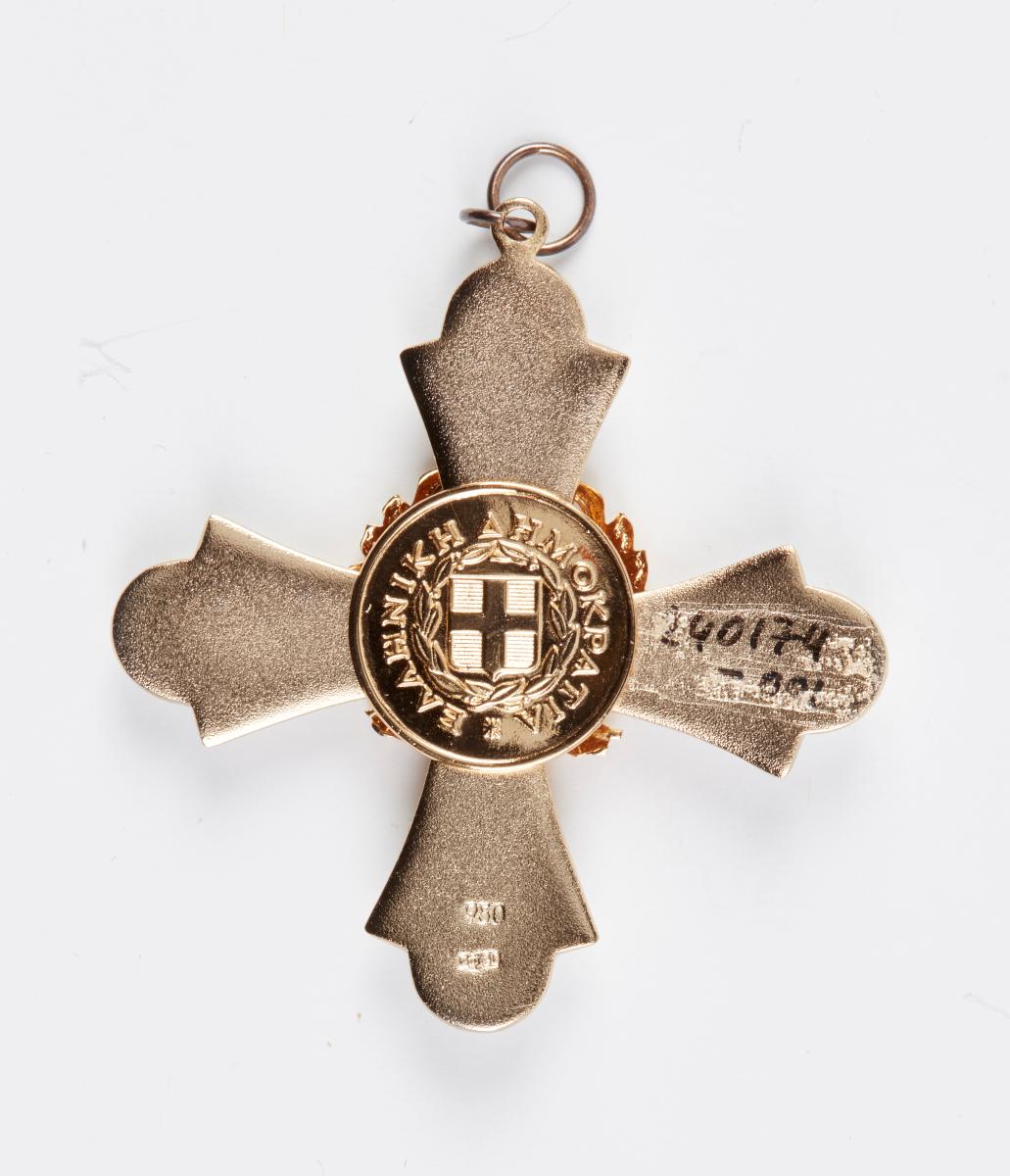 White enamel cross with a phoenix (symbolising the rebirth of the Greek nation) and a star on the upper arm of the cross. The reverse side of the cross bears the coat of arms of Greece. Orange ribbon edged with black.