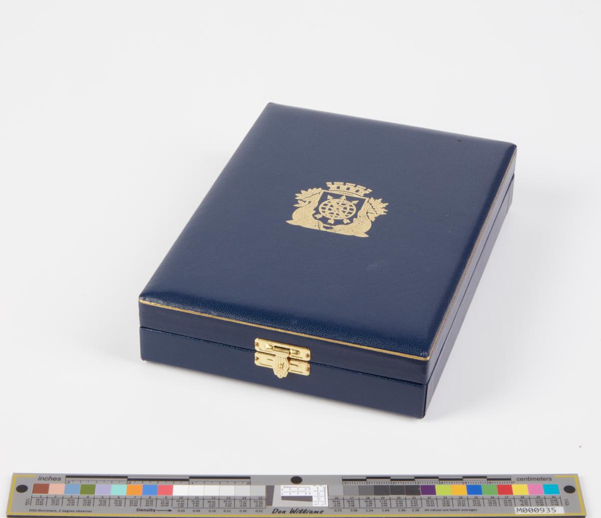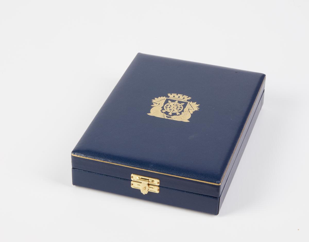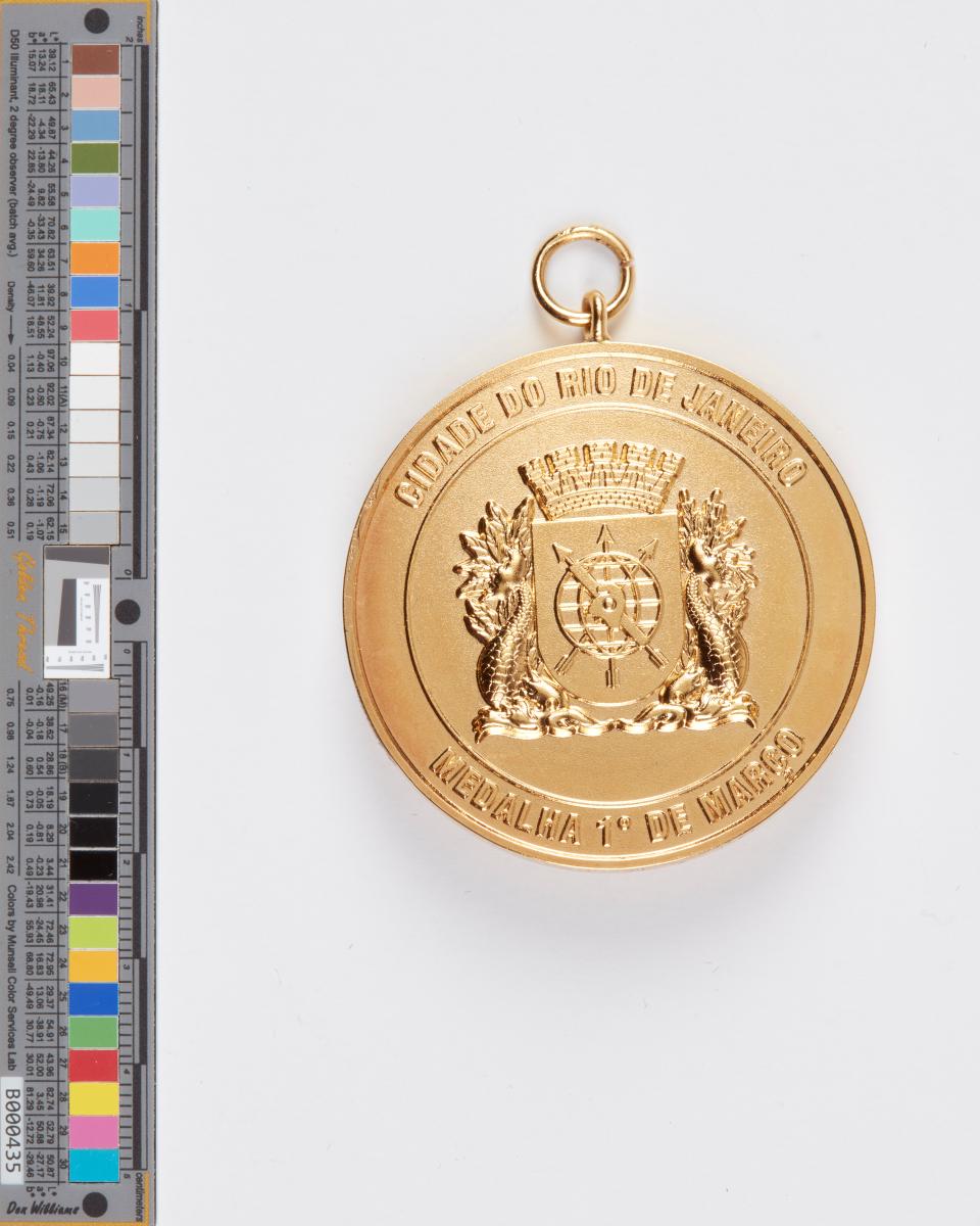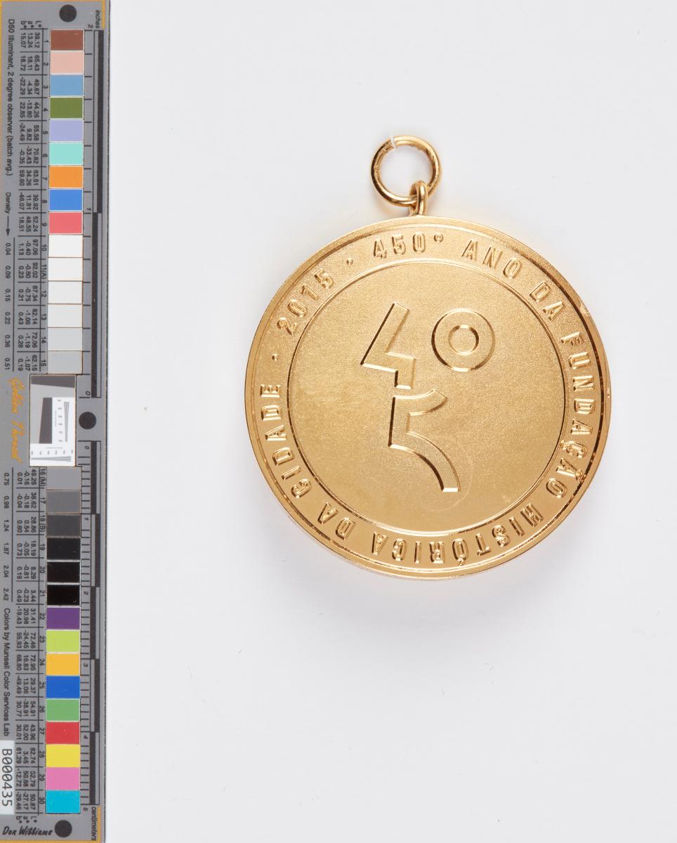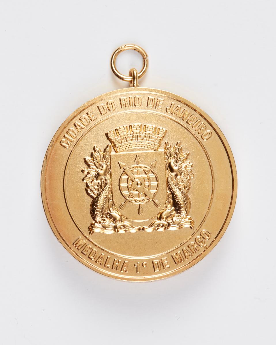 Medal with bail and ring. Obverse: coat of arms of the city of Rio de Janeiro and the inscription: ‘CIDADE DO RIO DE JANEIRO / MEDALHA 1° DE MARÇO’. Reverse: Logo for the 450th anniversary of the city of Rio de Janeiro, inscription: ‘450° ANO DA FUNDAÇÃO HISTÓRICA DA CIDADE - 2015’. Edge: Casa da Moeda do Brasil hallmark with the words ‘BRONZE’, “2015” and ‘0015’. The medal comes with a blue ribbon edged with white.