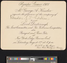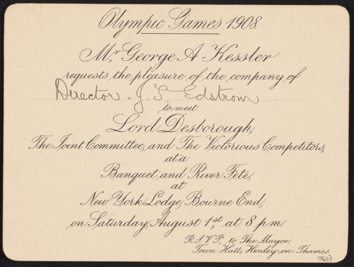 Banquet réunissant notamment le comité d'organisation et les concurrents victorieux au New York Lodge, Bourne End. Texte: "Olympic Games 1908 / Mr George A Kessler / requests the pleasure of the company of / Director J.S. Edstrom / to meet / Lord Desborough, / The Joint Committee, and the Victorious Competitors, / at a / Banquet and River Fete, / at / New York Lodge, Bourne End, / on Saturday, August 1st at 8 pm".