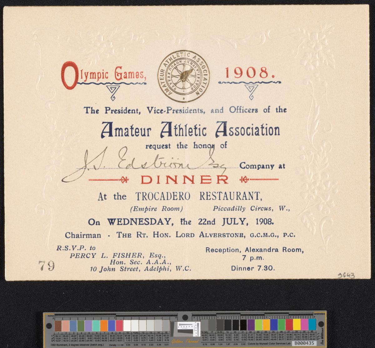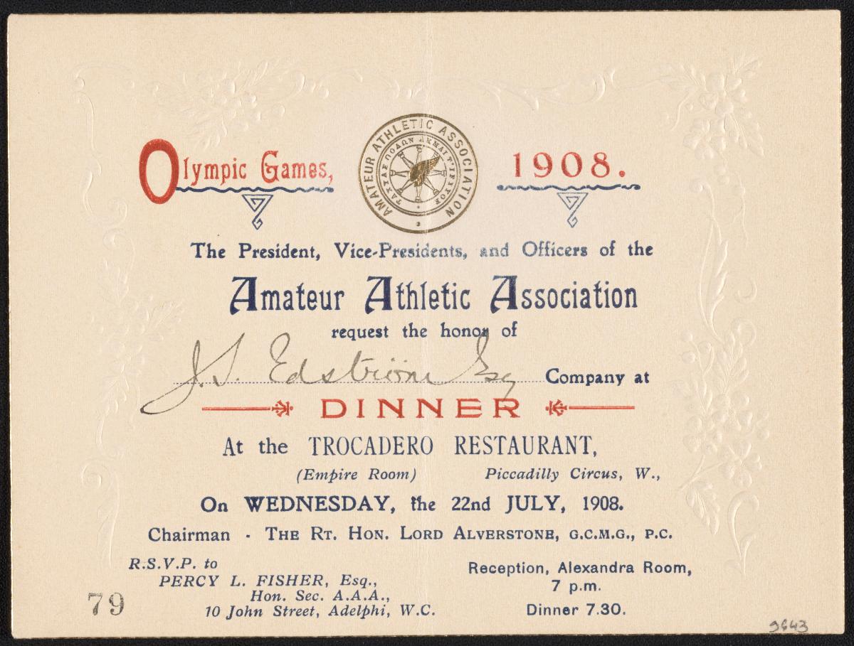 Banquet organisé par l'Association d'athlétisme amateur et réunissant le comité d'honneur et les membres du Comité olympique britannique. Emblème de la Fédération en haut au centre. Texte: "Olympic Games 1908. / The President, Vice-Presidents, and Officers of the / Amateur Athletic Association / request the honor of / J.S. Edström's Company at / DINNER / At the TROCADERO RESTAURANT, / On WEDNESDAY, the 22nd July, 1908".