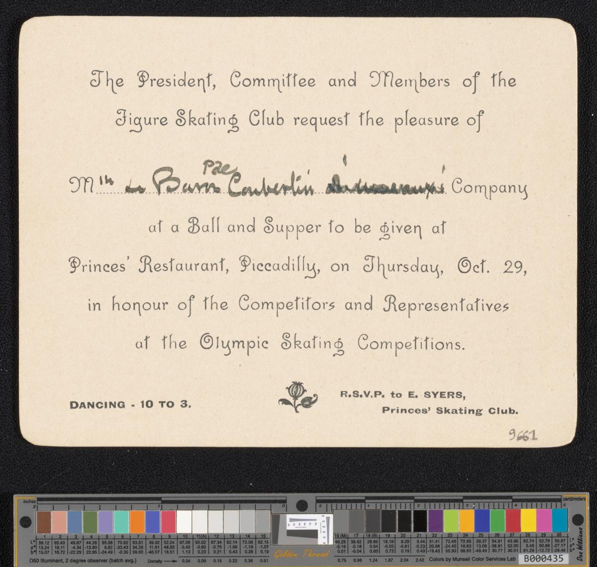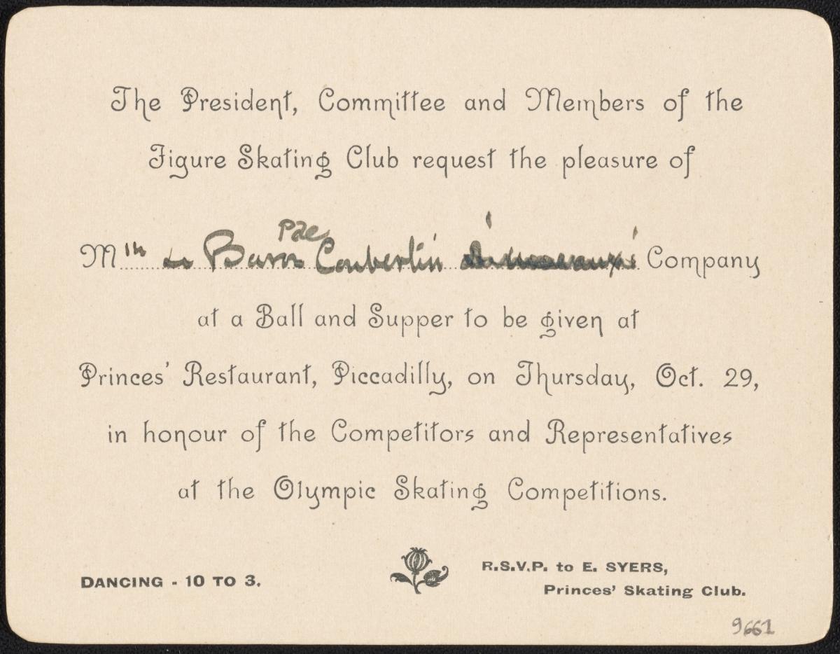 Londres 1908, carte d'invitation à un dîner le 29 octobre au Princes' Restaurant, Piccadilly, adressée au Baron Pierre de Coubertin.