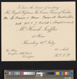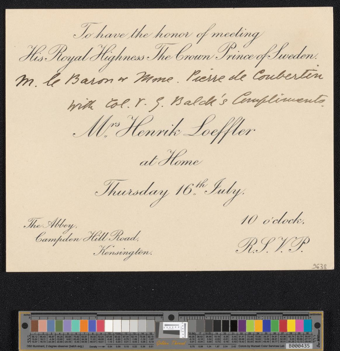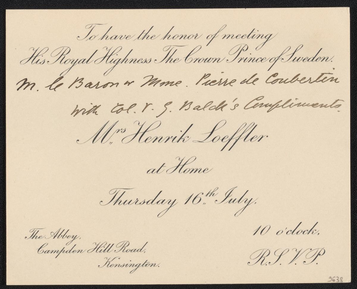 Carte avec la légende "To have the honor of meeting His Royal Highness The Crown Prince of Sweden M le Baron et Mme Pierre de Coubertin with Col. V. G. Balde's Compliments. Mrs Henrik Loeffler at Home Thursday 10th July."