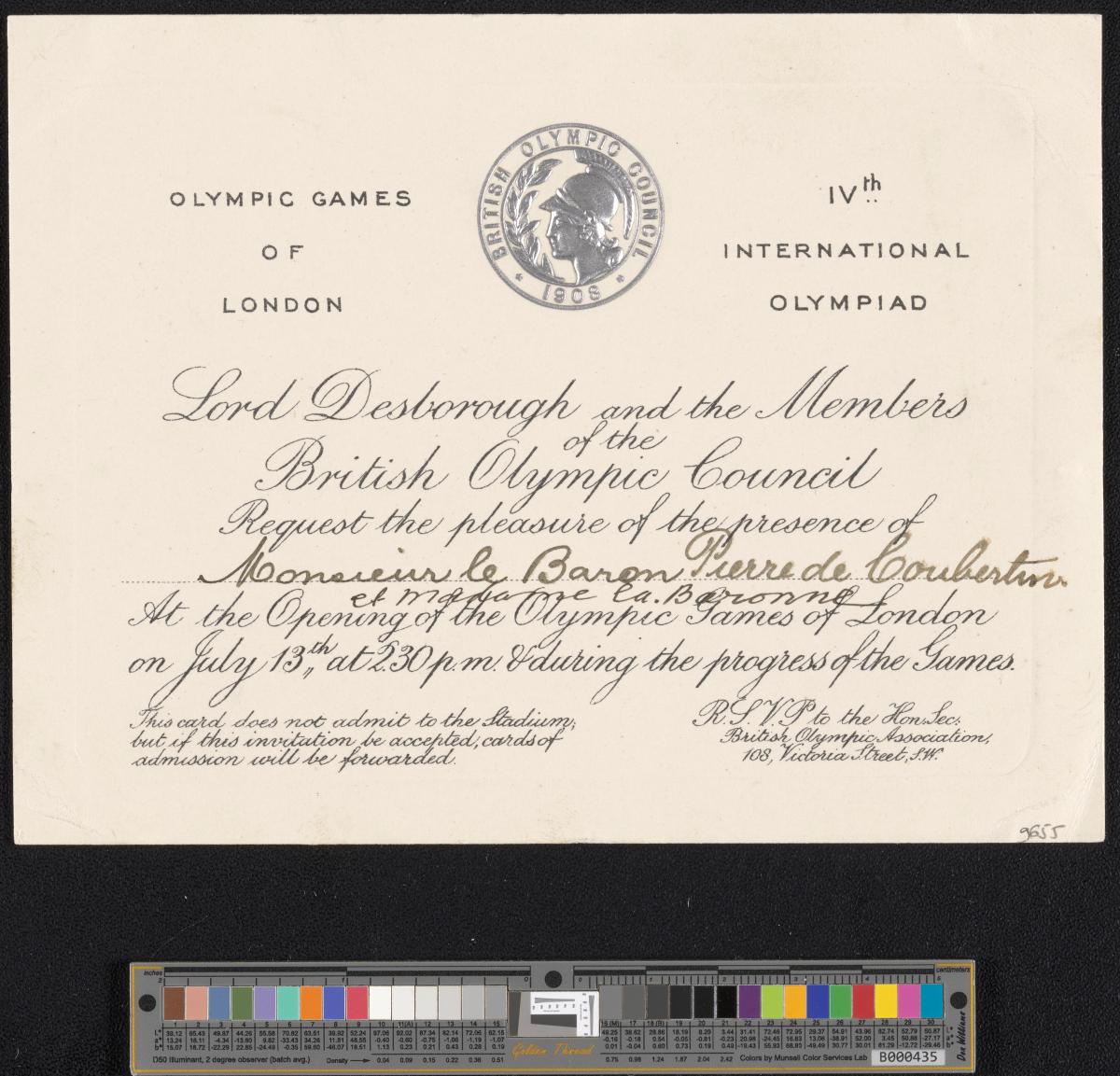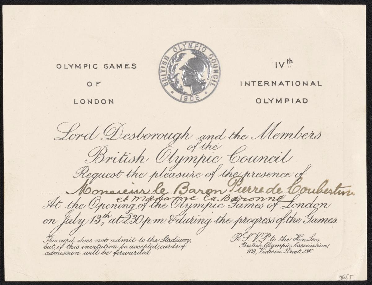 L'invitation est envoyée par Lord Desborough et les membres du Conseil olympique britannique et adressée au Baron Pierre de Coubertin et son épouse. Athéna et une branche de laurier sont représentés dans un médaillon.