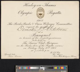 Les armoiries de Henley-on-Thames en doré et en relief figurent en haut de la carte. Texte: "Henley-on-Thames / Olympic Regatta / 1908 / The Berks, Bucks & Oxon Welcome Committee / request the company of / Director J.S. Edstrom / at a / Banquet / in honour of the competing oarsmen, / to be held in / The Lawns' Club Marquee, / (on the Bucks shore of the Regatta course.) / on Friday, July 31st 1908. / at 7 o'clock p.m.".