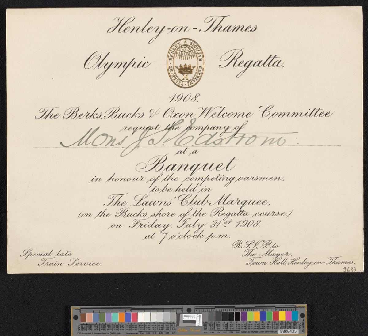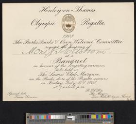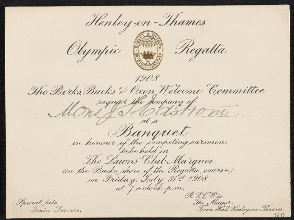 Les armoiries de Henley-on-Thames en doré et en relief figurent en haut de la carte. Texte: "Henley-on-Thames / Olympic Regatta, / 1908. / The Berks, Bucks & Oxon Welcome Committee / request the company of / Mons. J.S. Edstrom / at a / Banquet / in honour of the competing oarsmen, / to be held in / The Lawns' Club Marquee, / (on the Bucks shore of the Regatta course.) / on Friday, July 31st 1908. / at 7 o'clock p.m.".