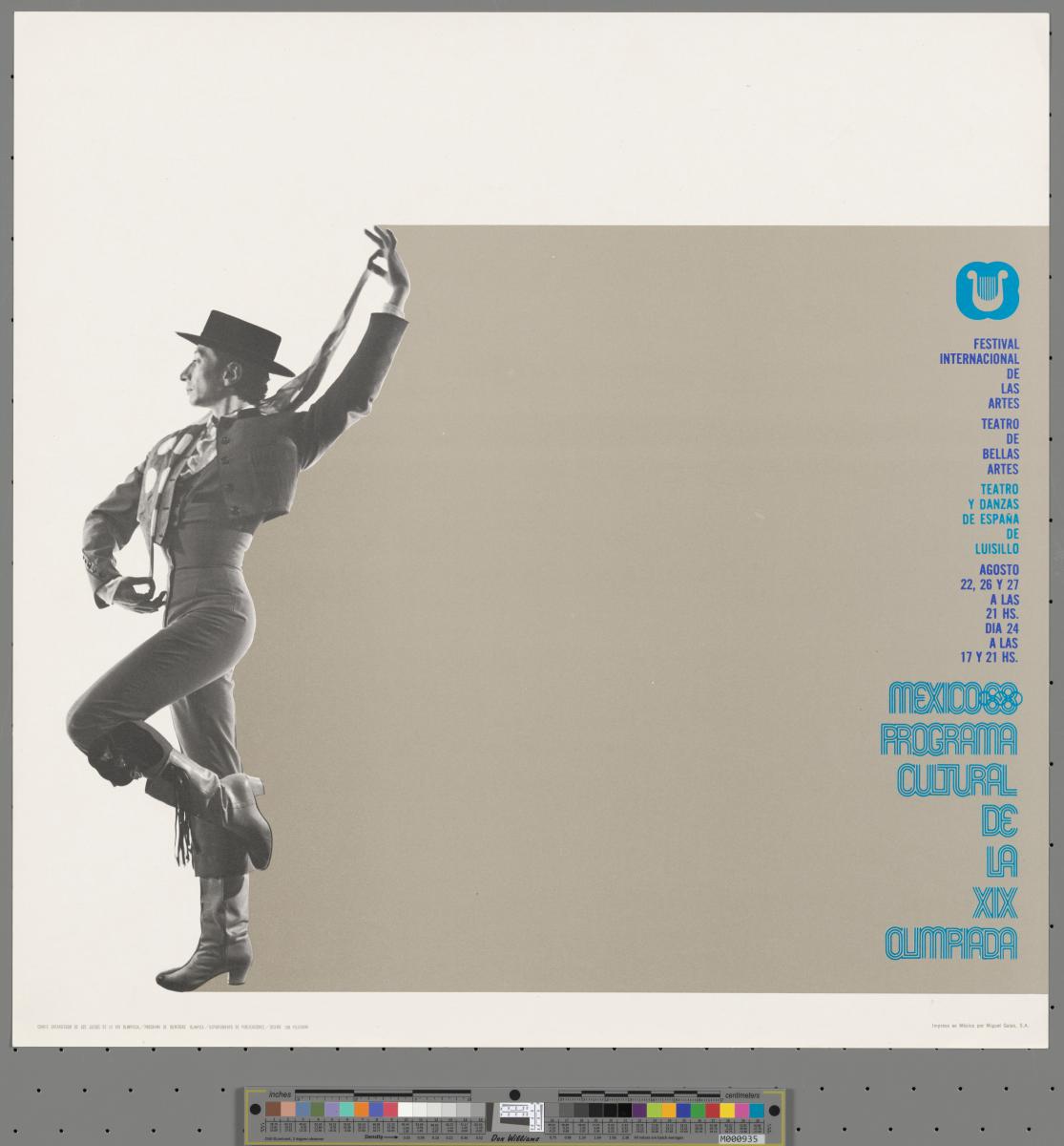 Photographie d'un danseur de flamenco. Légende: "Festival internacional de las artes Mexico 68 Programa cultural de la XIX Olimpiada". Pictogramme du Festival des arts et emblème des Jeux.