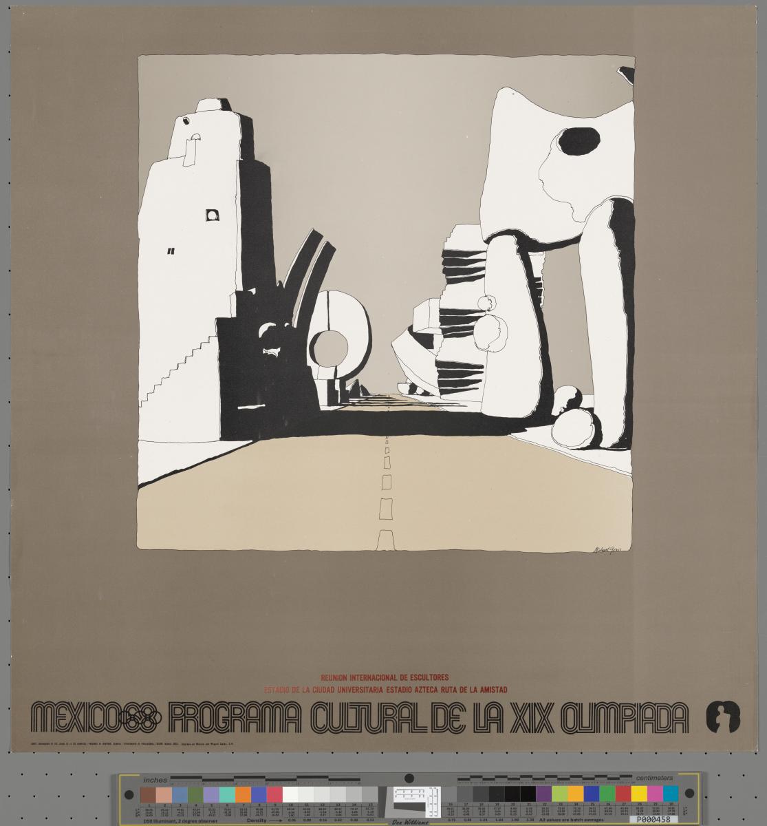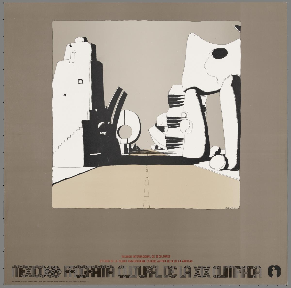 Lég. "Mexico 68 Programa cultural de la XIX Olimpiada Reunion internacional de escultores". Dessin d'une route avec des sculptures monumentales (sculptures de Gonzalo Fonseca, Angela Guria, Jacques Moeschal, Pierre Szekely, Herbert Bayer, etc.), signé par l'artiste. Pictogramme.