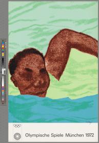 Nageur africain. Emblème des Jeux et légende: "Olympische Spiele München 1972". Signé en bas à droite.