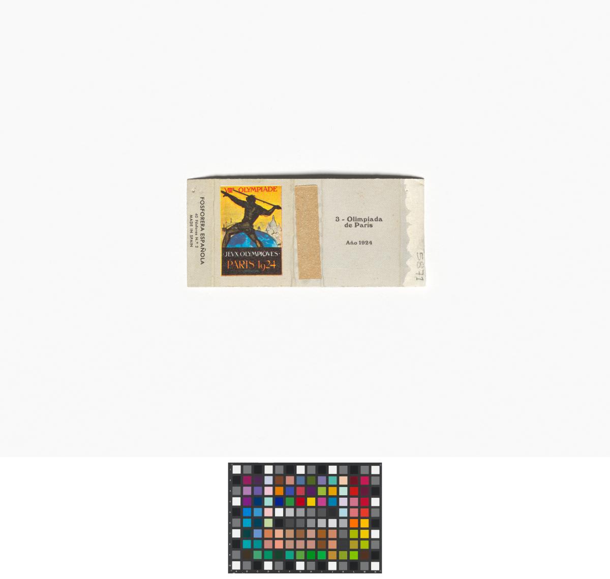 Image de l'affiche officielle des Jeux de Paris. Légende: "Olimpiada de Paris Ano 1924" au dos de la boîte et "Fosforera Espanola" sur la tranche.