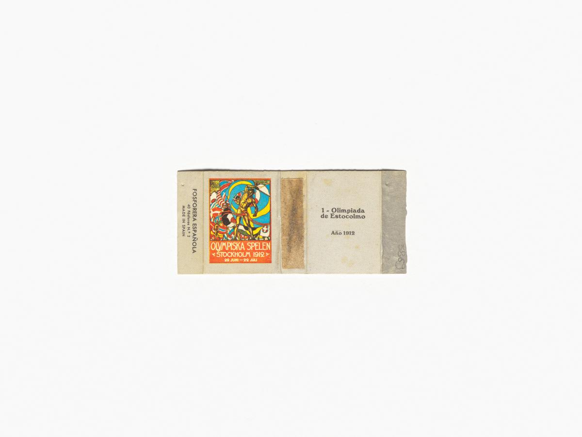 Représentation de l'affiche des Jeux. Légende: "Olimpiada de Estocolmo Ano 1912" au dos de la boîte et "Fosforera Espanola" sur la tranche.