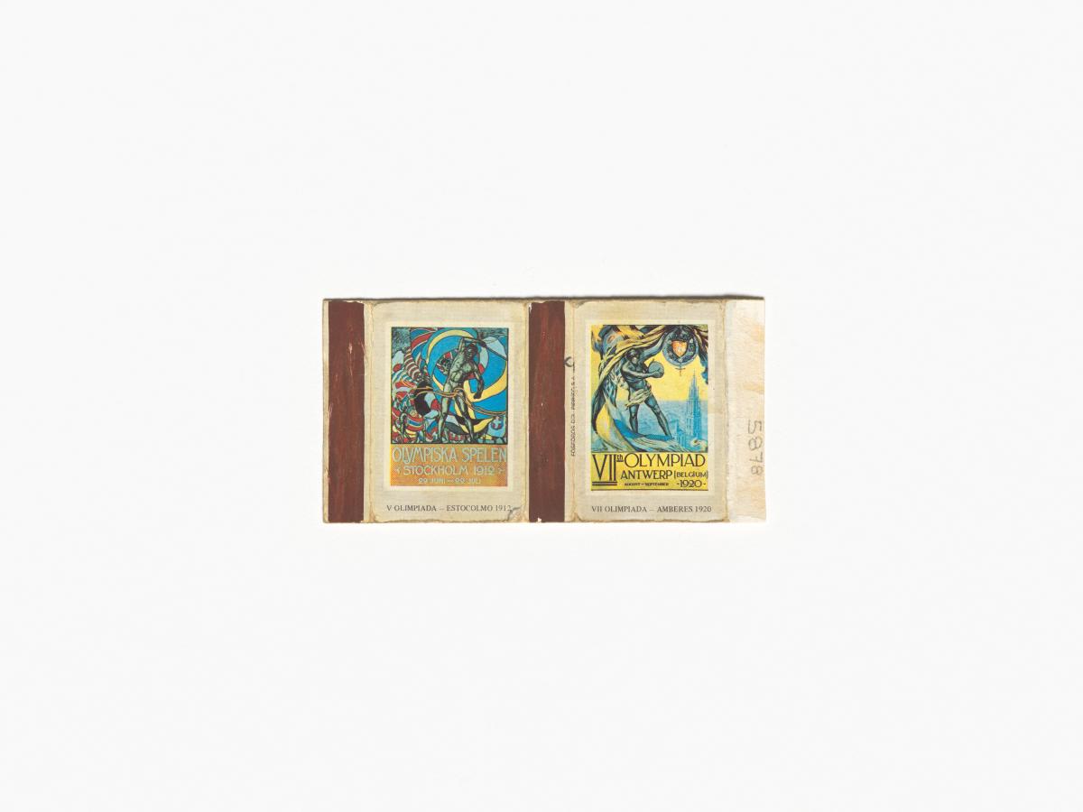 Stockholm 1912, boîte d'allumettes dépliée avec l'affiche officielle des Jeux de 1912 et de 1920.
