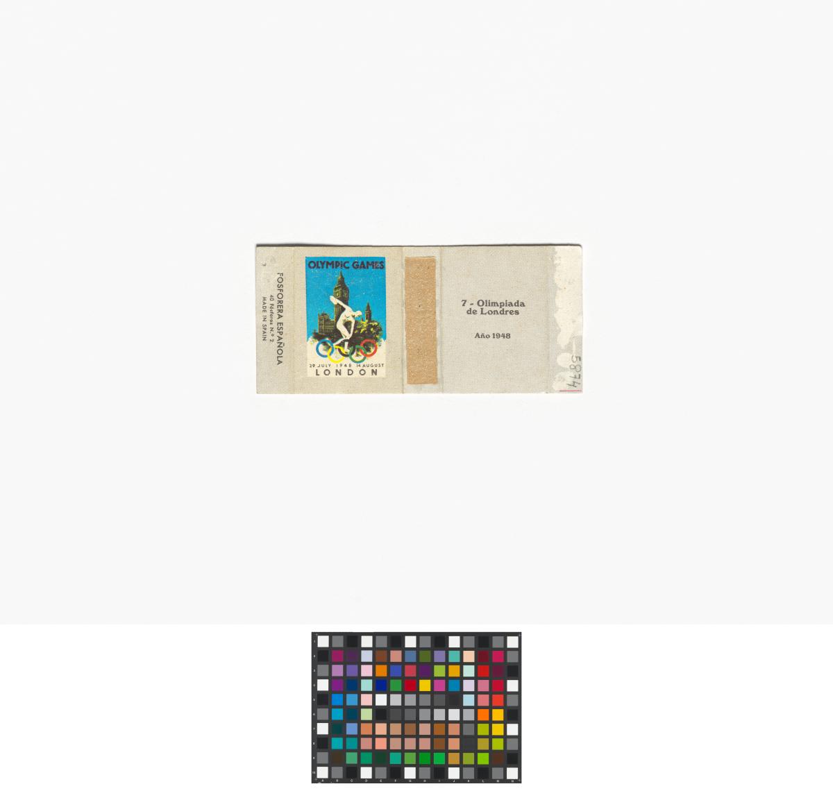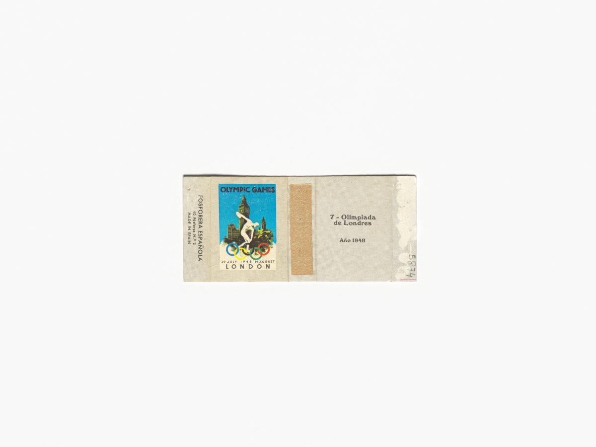 Représentation de l'affiche des Jeux. Légende: "Olimpiada de Londres Ano 1948" au dos de la boîte et "Fosforera Espanola" sur la tranche.