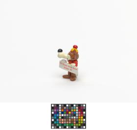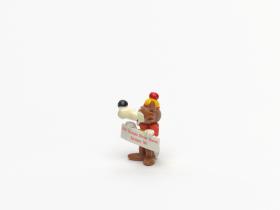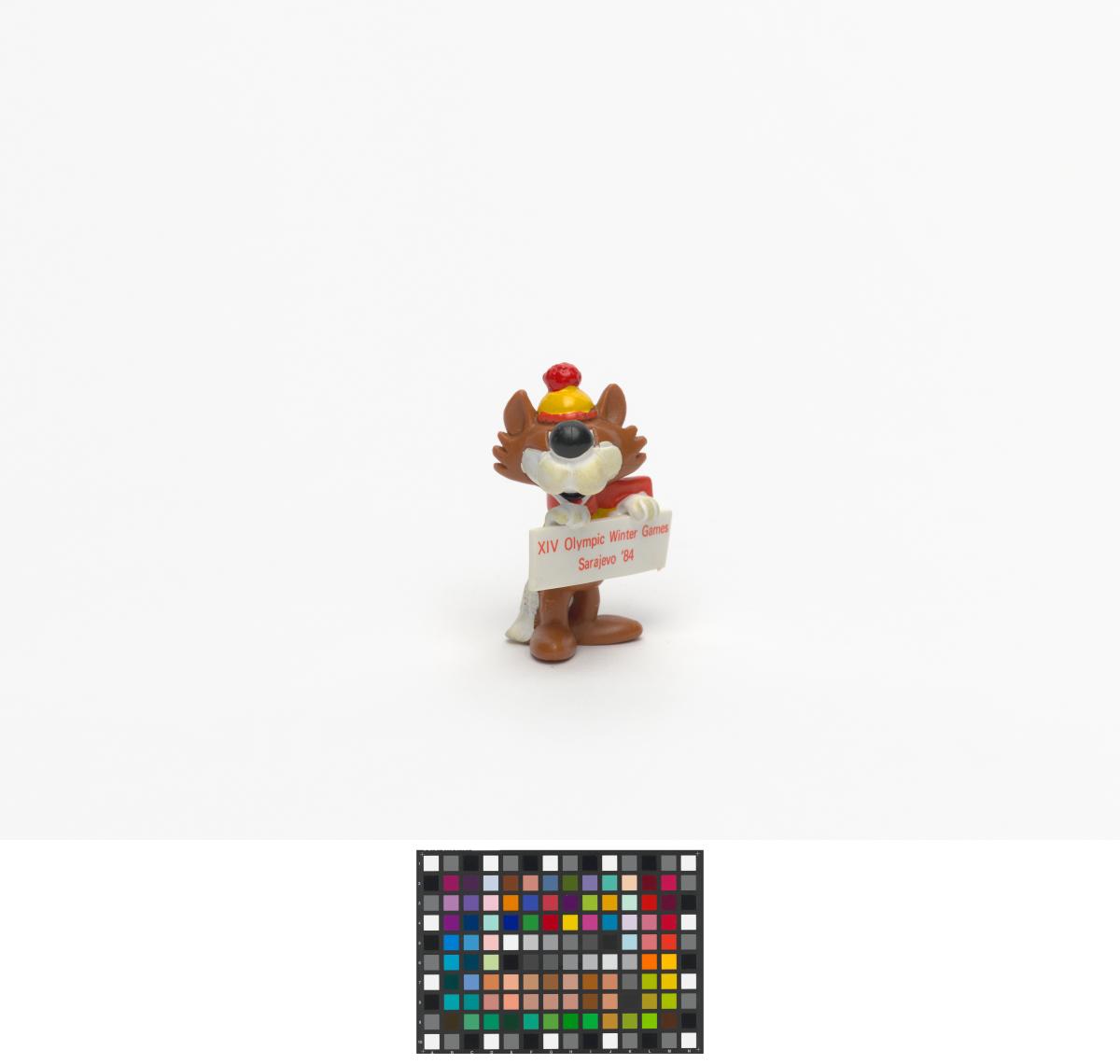 Figurine représentant Vuchko, la mascotte des Jeux, tenant une petite pancarte avec légende: "XIV Olympic Winter Games / Sarajevo 1984".