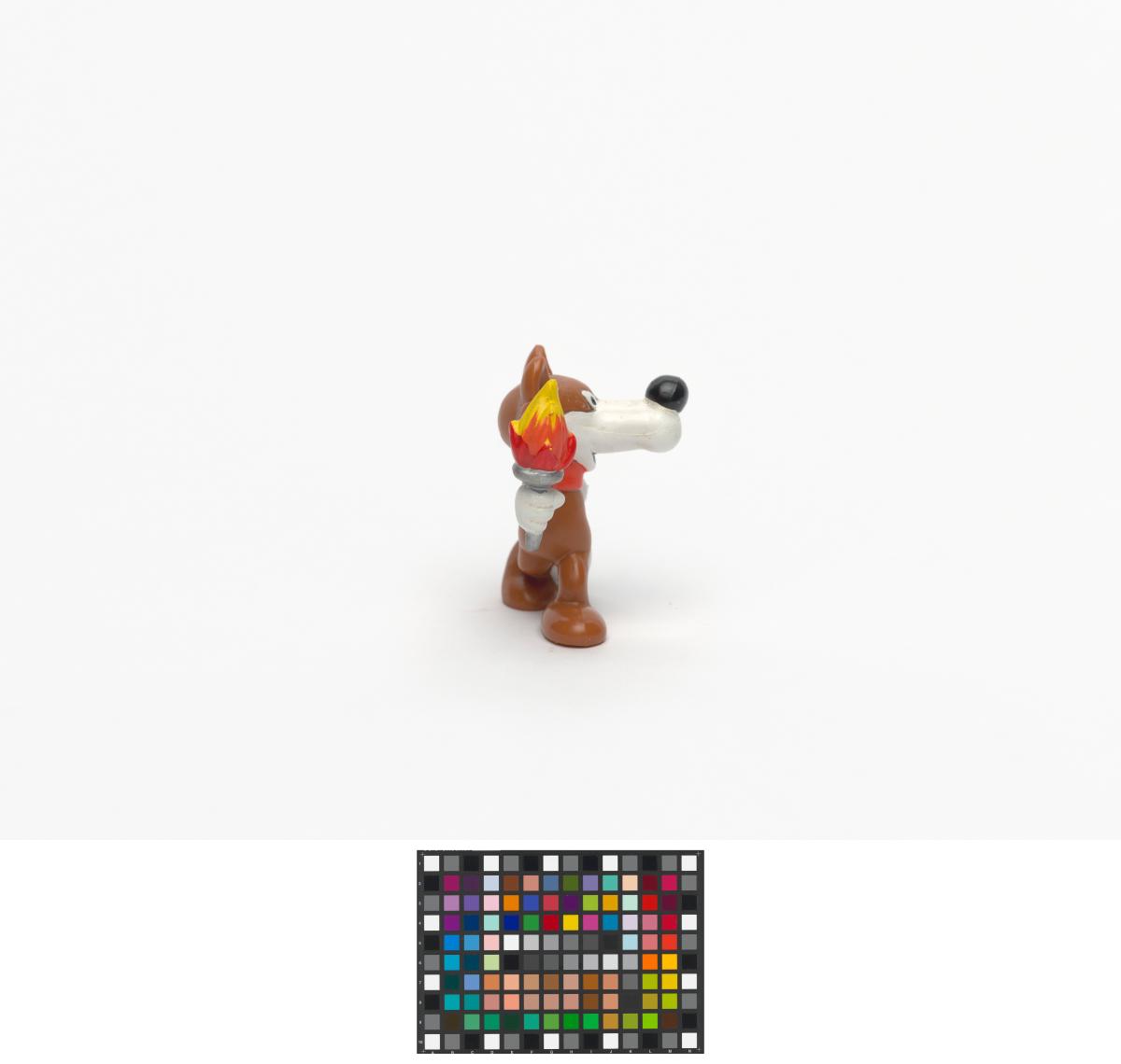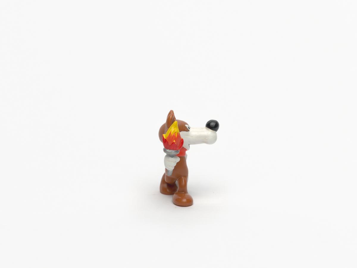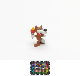 Figurine représentant Vuchko, la mascotte des Jeux, portant la flamme olympique.