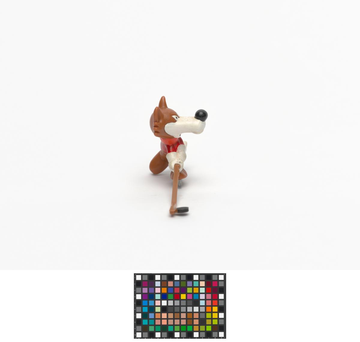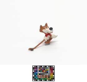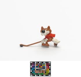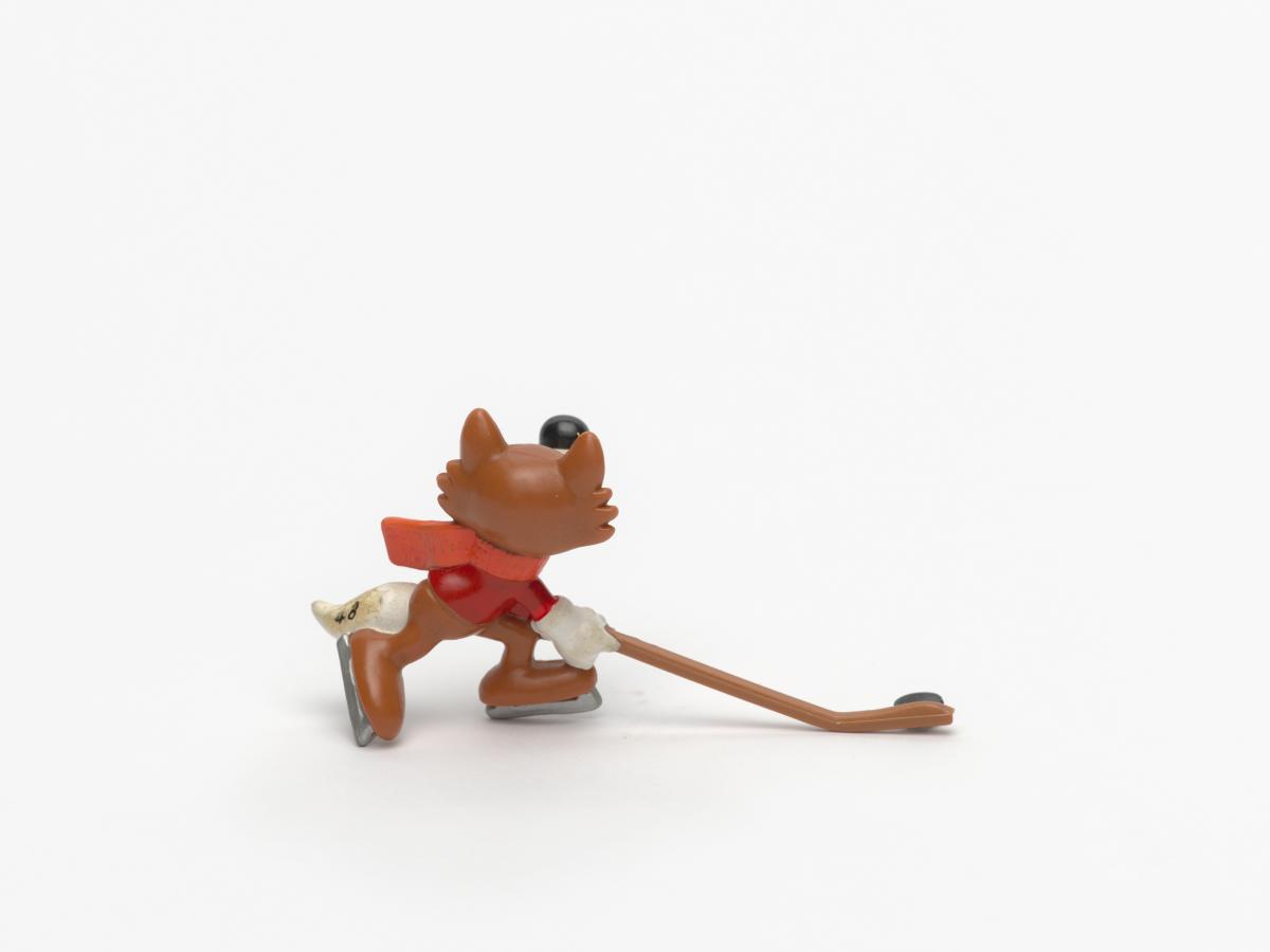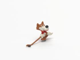 Figurine représentant Vuchko, la mascotte des Jeux, faisant du hockey sur glace.