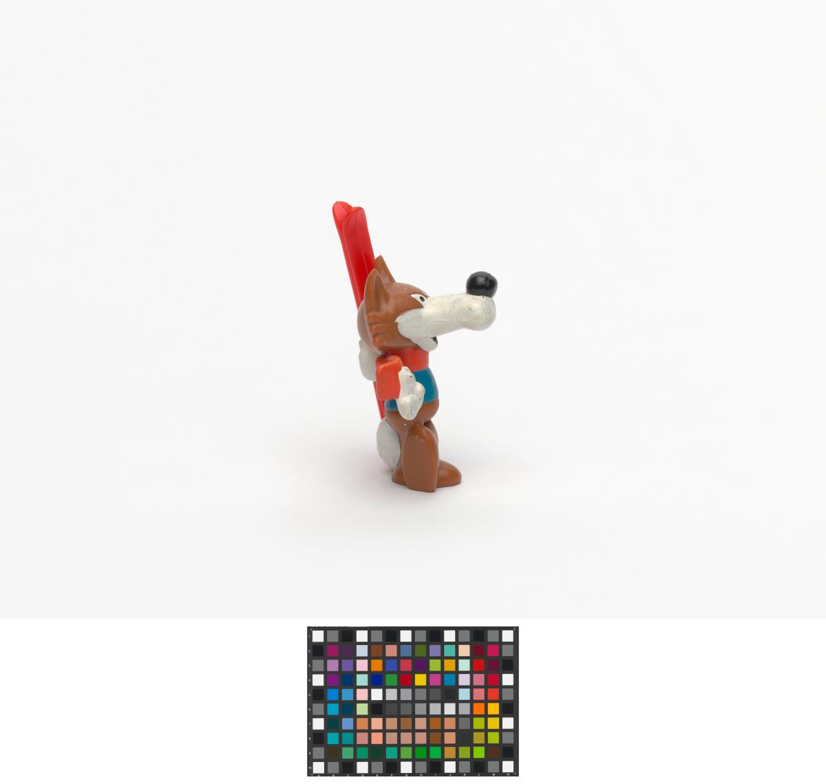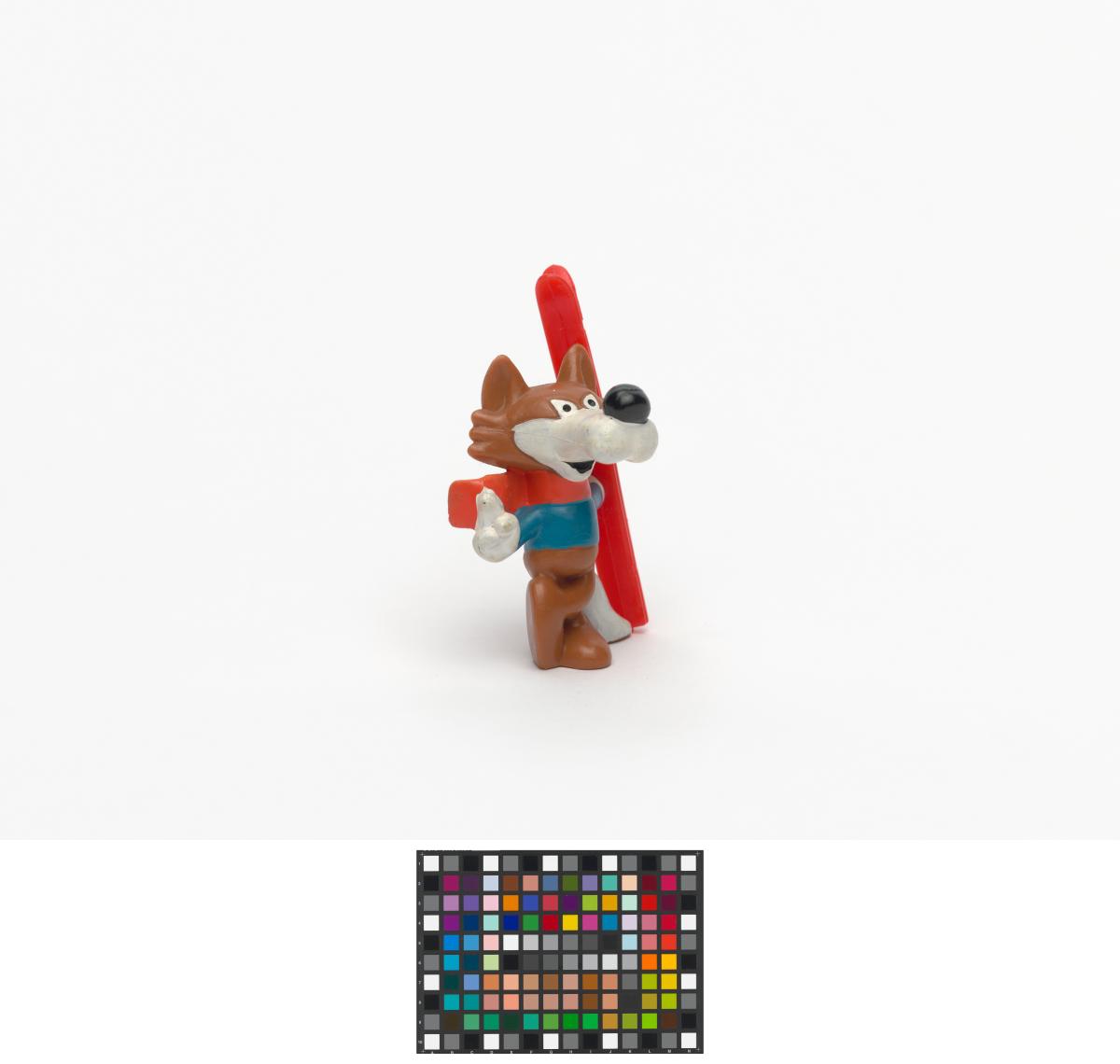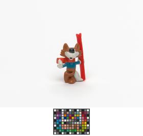 Figurine représentant Vuchko, la mascotte des Jeux, tenant une paire de skis.